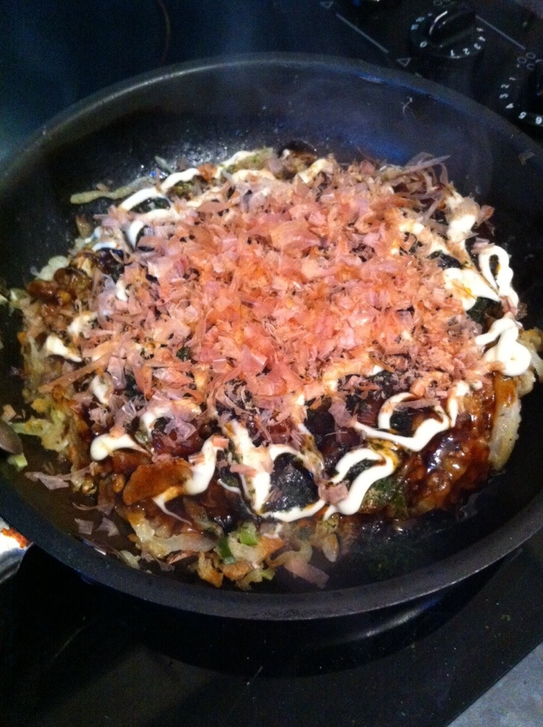 Tuesday: okonomiyaki. It didn’t turn out as good as it usually does. I thought putting some grated purple sweet potato in the mix would be a good idea. It wasn’t.