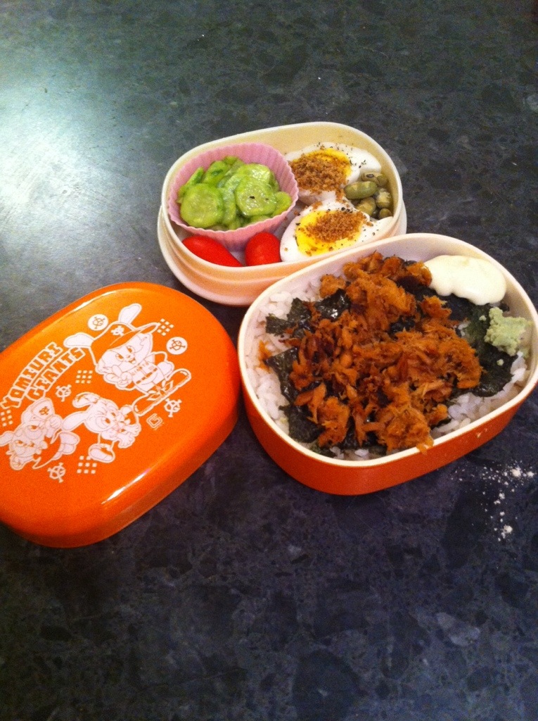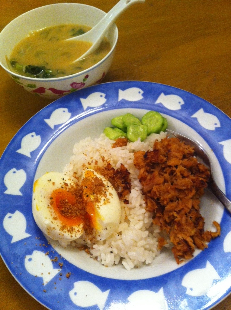 Tuna, soft boiled egg, cucumber pickles on rice. With miso soup. Yum!