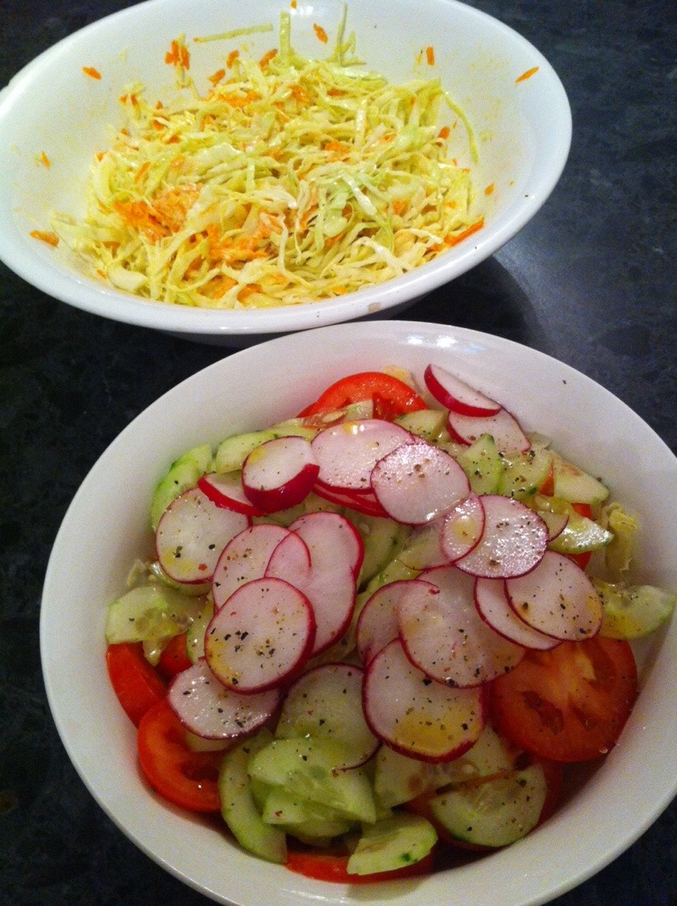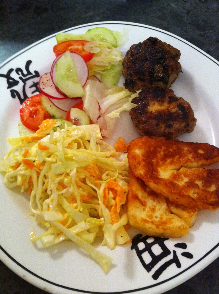 Lamb burgers. Salad. Coleslaw. Haloumi.