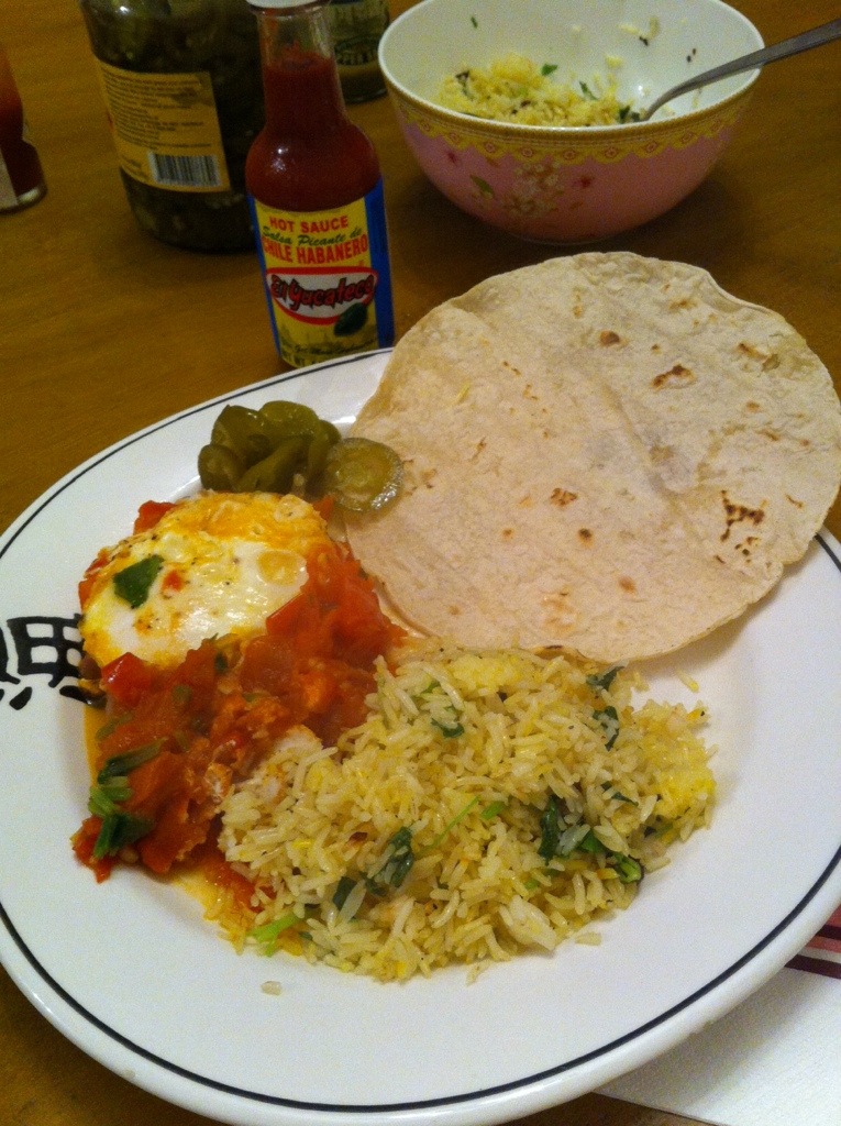 Cooked up some leftover rice with some garlic & coriander and done corn torillas and what you have here is a very delicious dinner.