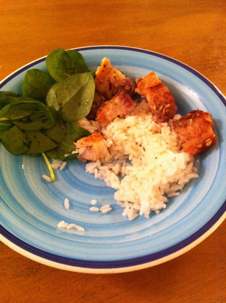 This flu of mine is still hanging around. Today I couldn’t really be bothered cooking, but in the end decided to cook the pork belly rashes I had in the fridge. They turned our quite tasty ( just oven roasted with a bit of salt, pepper and fennel. I love fennel) . Had them with some rice and spinach. I forgot to take a photo until I was already half way through!
