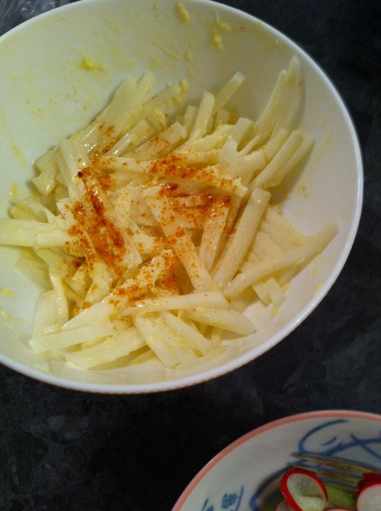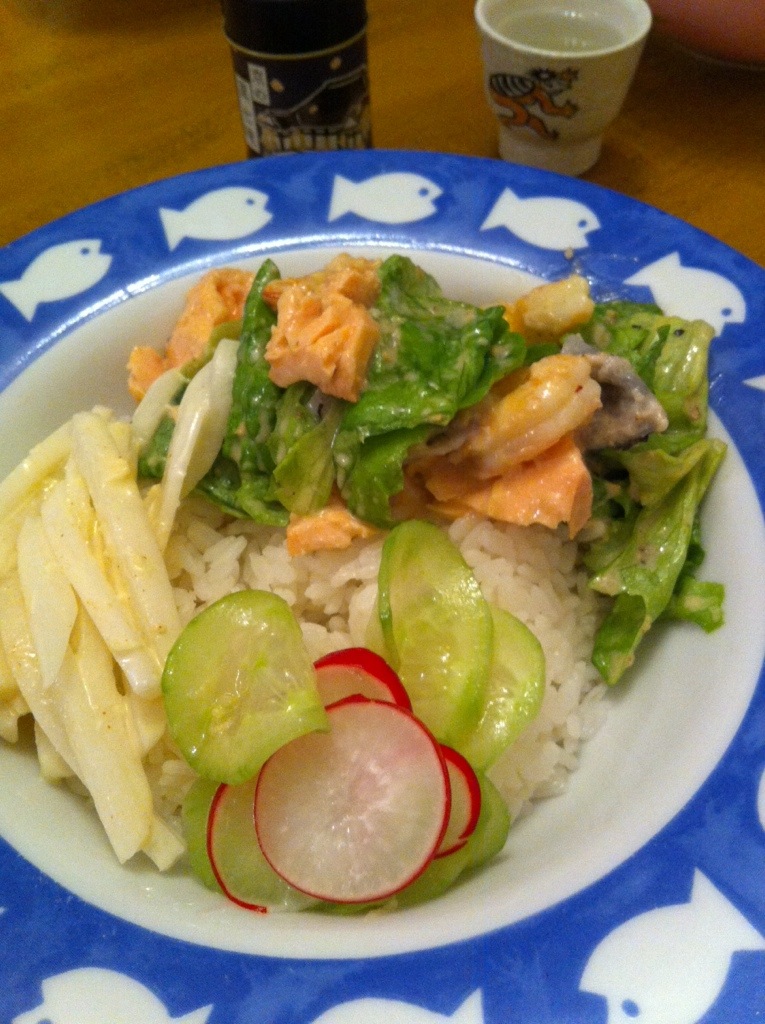 More rice! This meal was a real winner! Super delicious! Salmon boiled in water with a bit of sake. Then mixed through a “dressing” of various things including ground sesame seeds, soy sauce, mayonnaise with some lettuce then served on steamed rice. So good! Also made daikon radish salad and cucumber & radish pickles. Would have again.