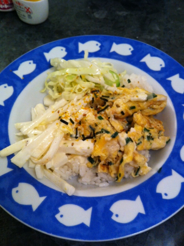 You know I like eggs and rice. This was a bit of a twist on my usual – scrambled eggs with chives on rice. With daikon radish salad and pickled cucumbers and cabbage.