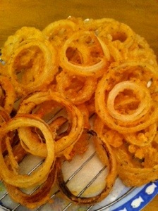 I didn’t know what to make for dinner tonight. At the last minute I decided on fish tacos and sent Steve down to the shops to pick up some crappy frozen fish. Having a surplus of onions at the moment I decided to make onion rings too. It the end it ended up being a great dinner. And the leftovers were great for lunch the next day.