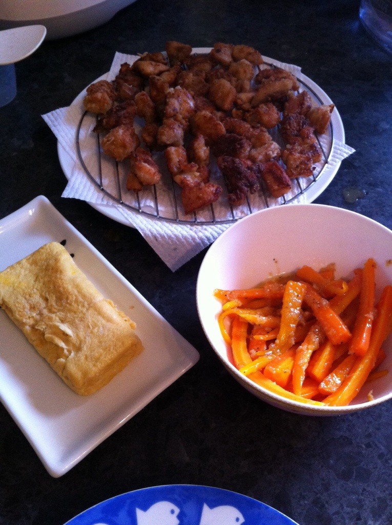Karaage chicken, honey garlic carrots, tamagoyaki and rice.