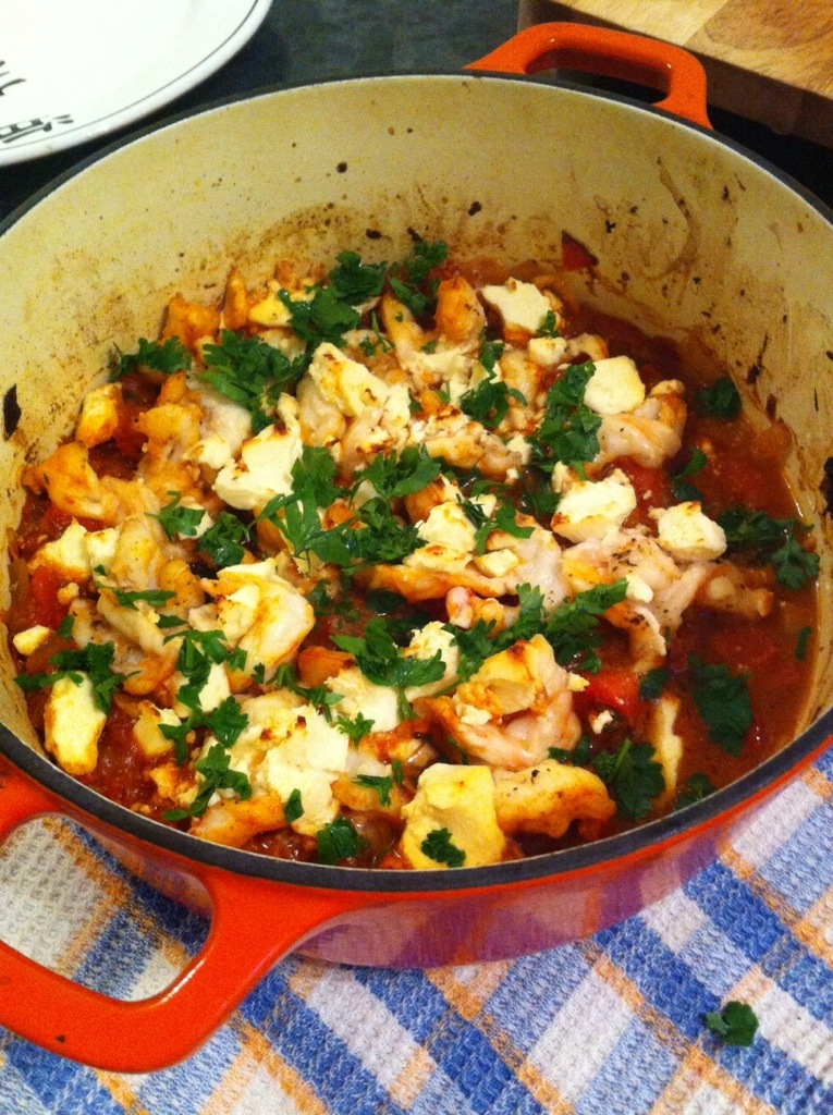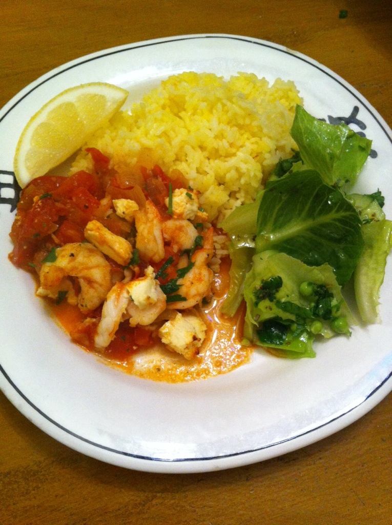 Prawns, feta, tomatoes, herbs, saffron rice. Nothing bad here.