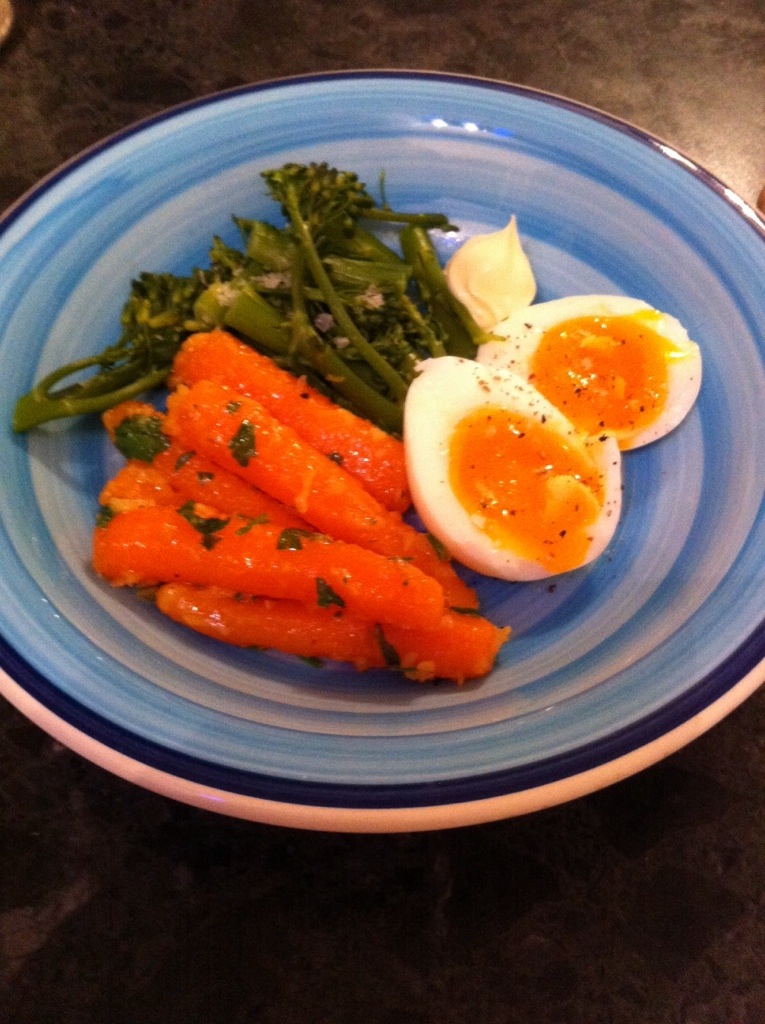 Friday’s dinner – well it was going to be eggs etc on rice. But something happened to the rice whilst cooking and it had this weird sticky stuff in it and I decided (given that I’ve spent the last three weeks sick) it’d be best not to eat it. So we had egg and brocolini and carrots. It was ok, I was feeling pretty rubbish anyway and didn’t have much of an appetite.