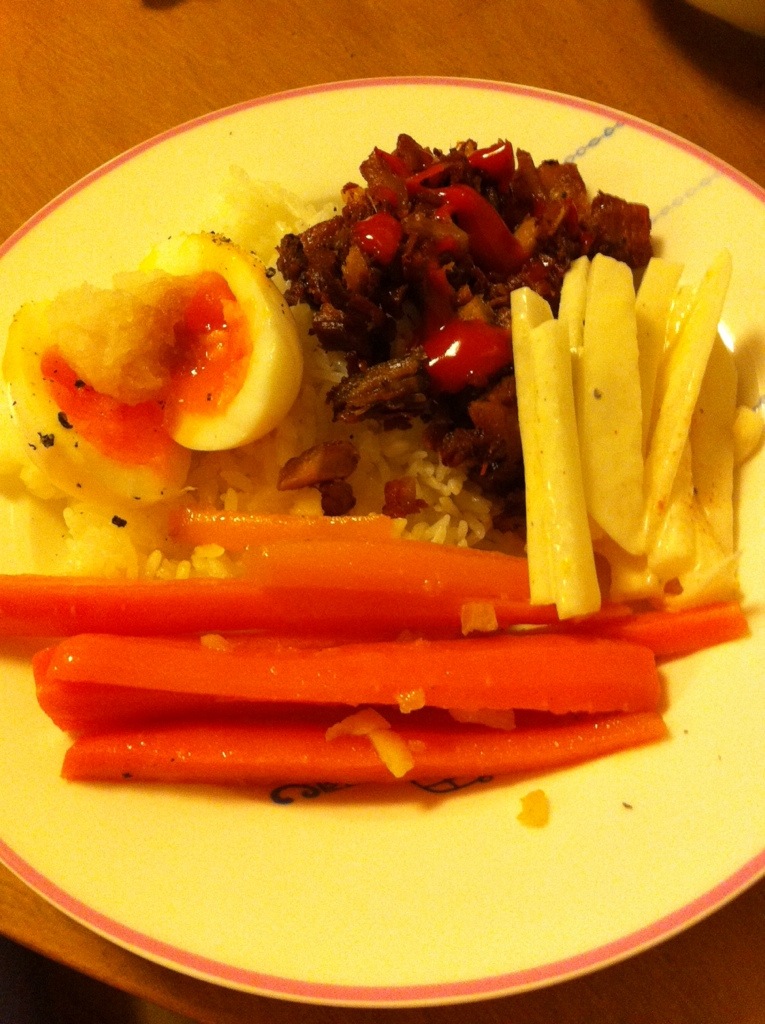 I was going to make Onigiri, but then I got over it and just put everything on top of the rice. Leftover pork, garlic & honey carrots, egg and daikon salad.