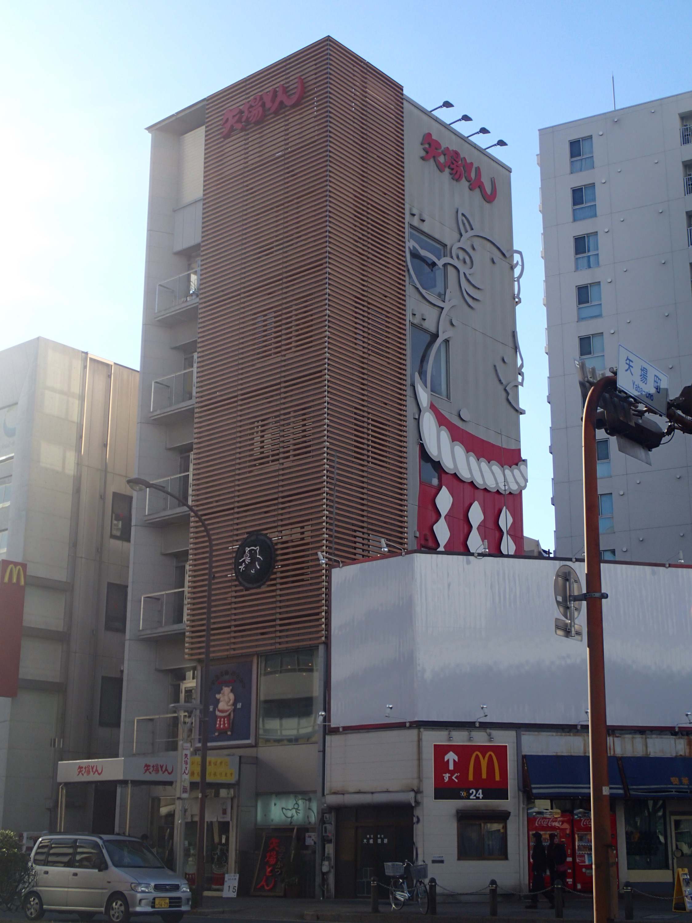 As we left, their mascot, a pig (buta) was dancing around outside. We couldn’t resist getting a photo with him, seeing as though we’d just eaten his relatives and all 😕