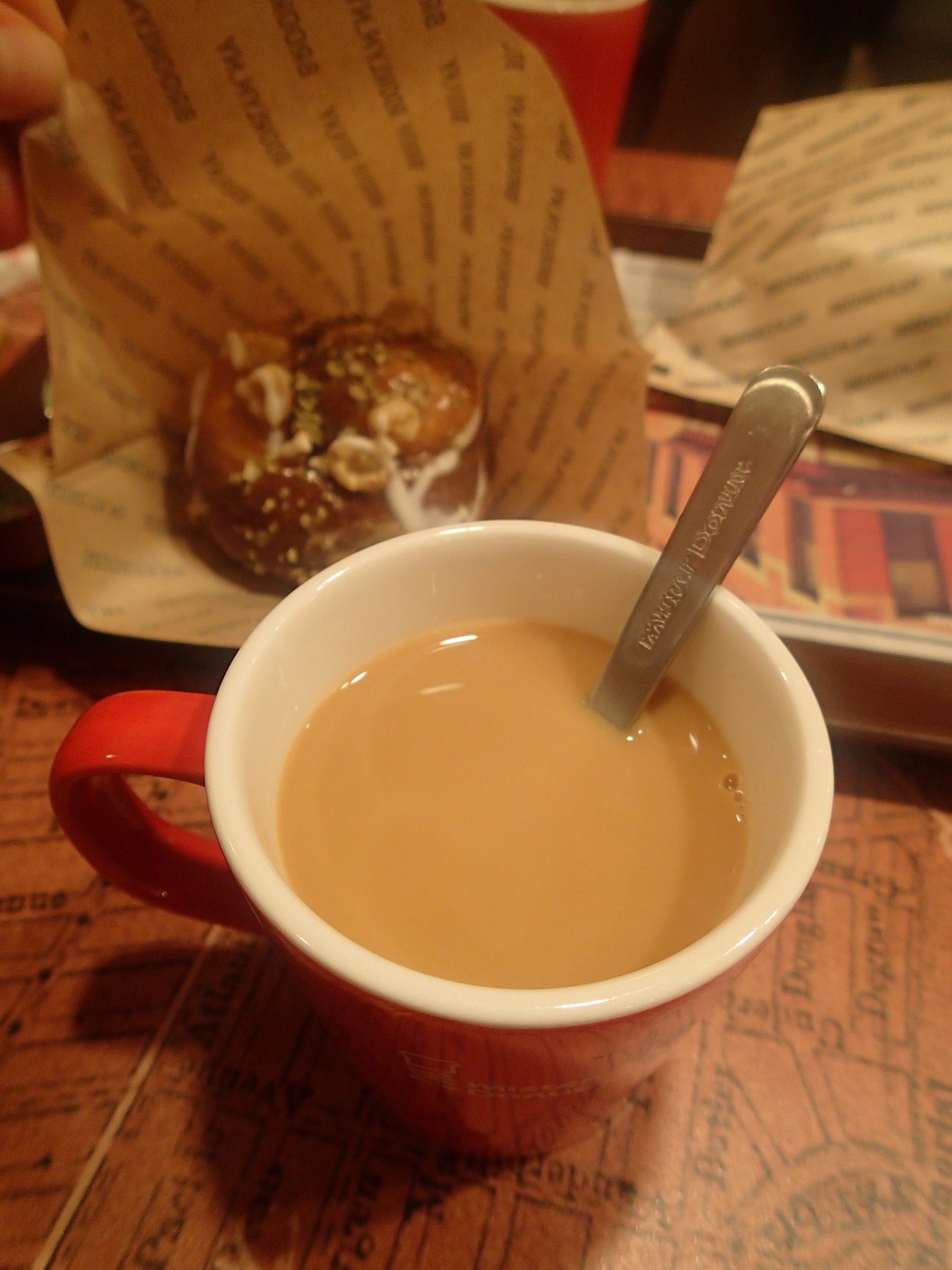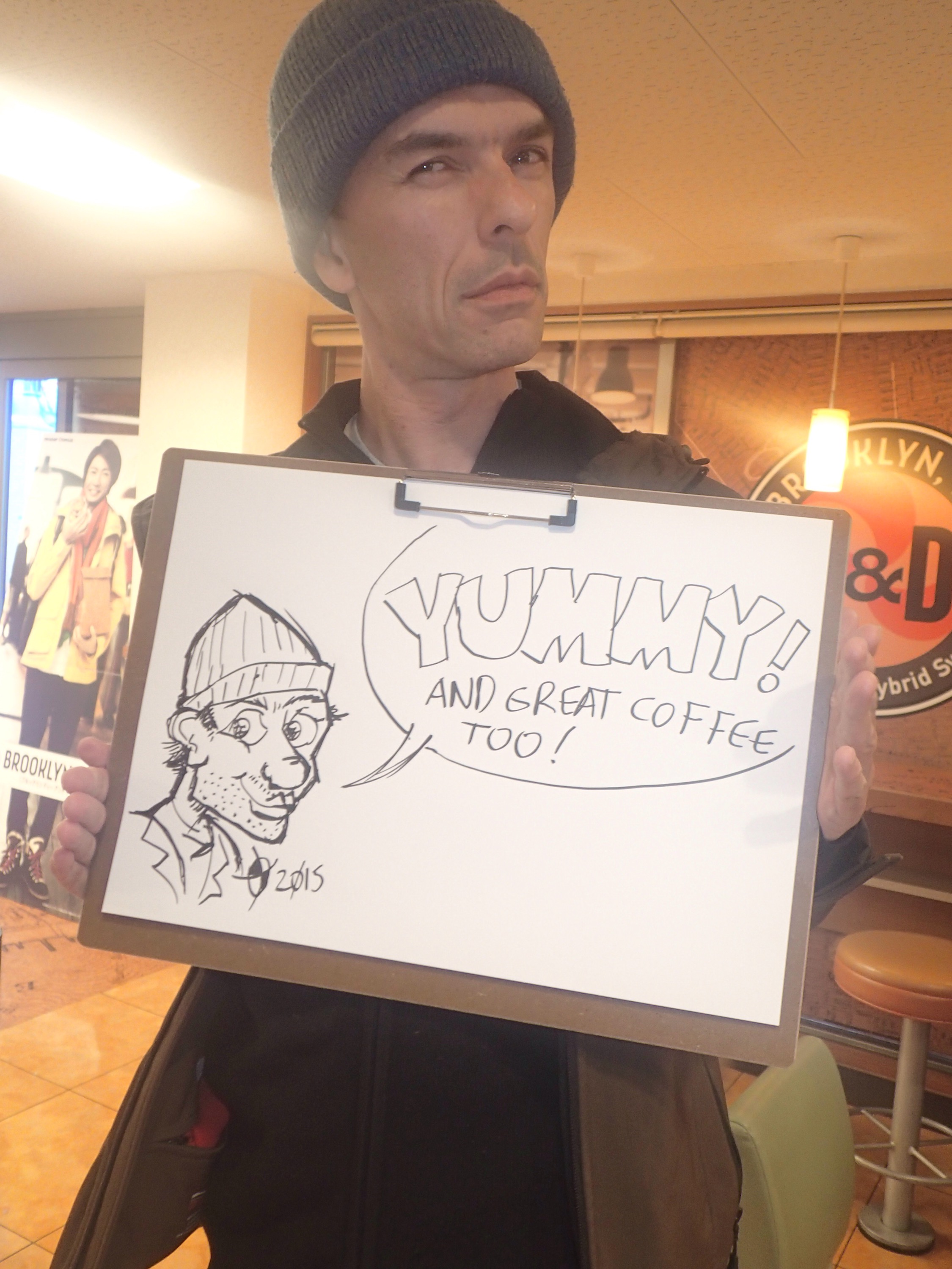We stopped in at Mister Donut for an afternoon snack and were pleasantly surprised to find out they were trialling a new type of donut. Therefore we got one each (and a coffee) for free in return for having our photo taken with our comments about the donuts written on a board.