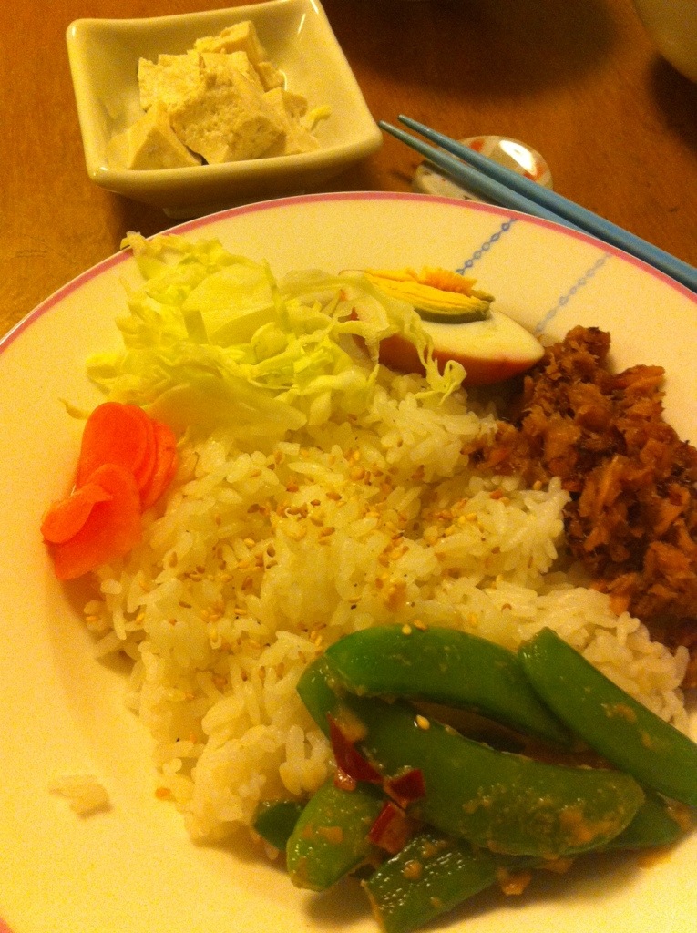 My go to meals are always Japanese. Tuna, snow peas, the last of my delicious tofu, rice, cabbage etc etc