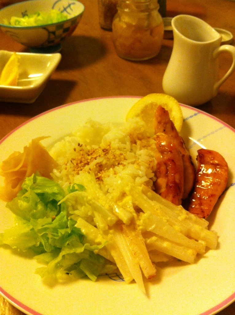 Feeling a bit tired today, and sadly think I’m coming down with a cold. At least I made it through Burgerpalooza. Made grilled chicken, daikon salad, rice etc
