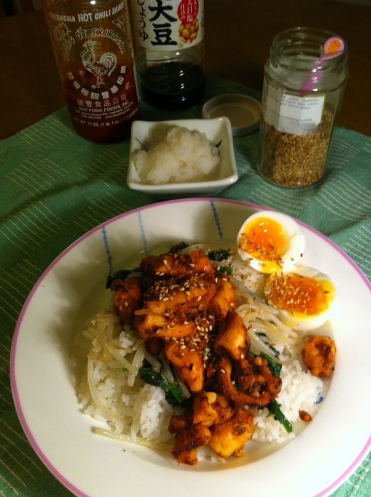 SO good. Octopus, bean sprouts, spinach, sesame seeds, Siracha, rice – nothing bad here!