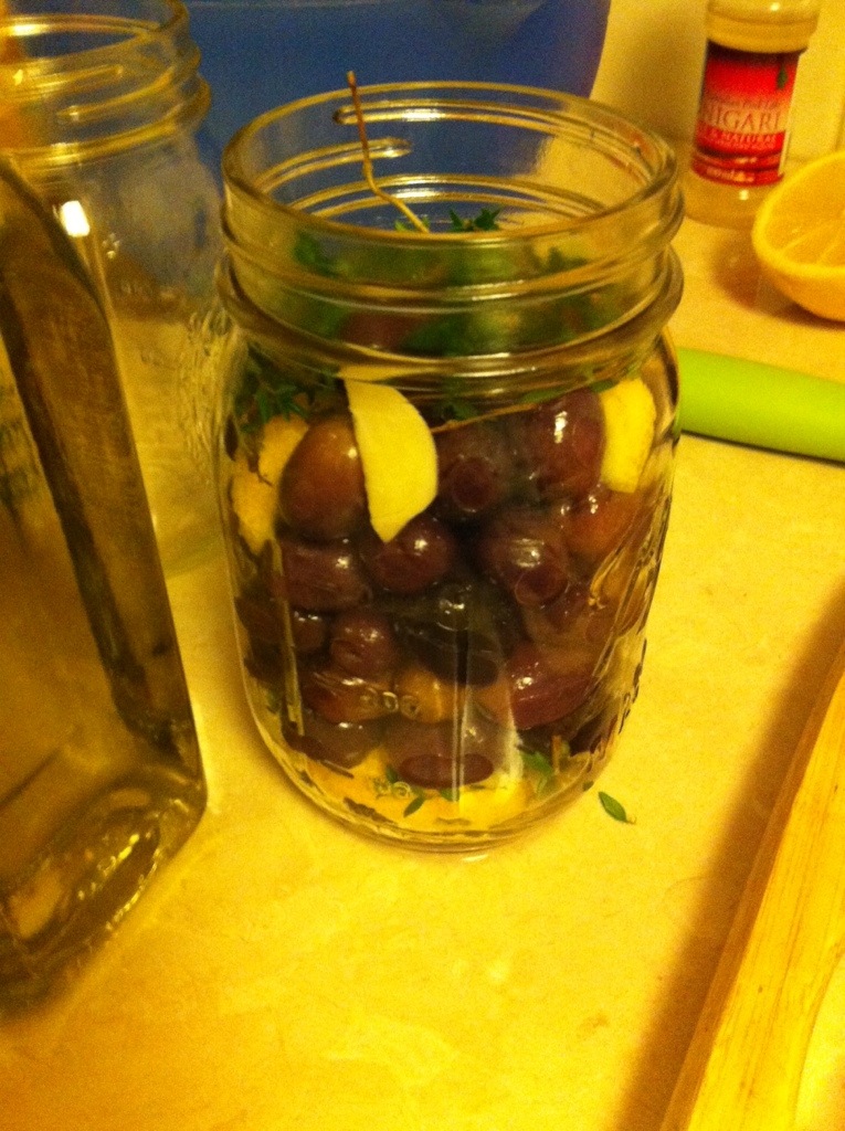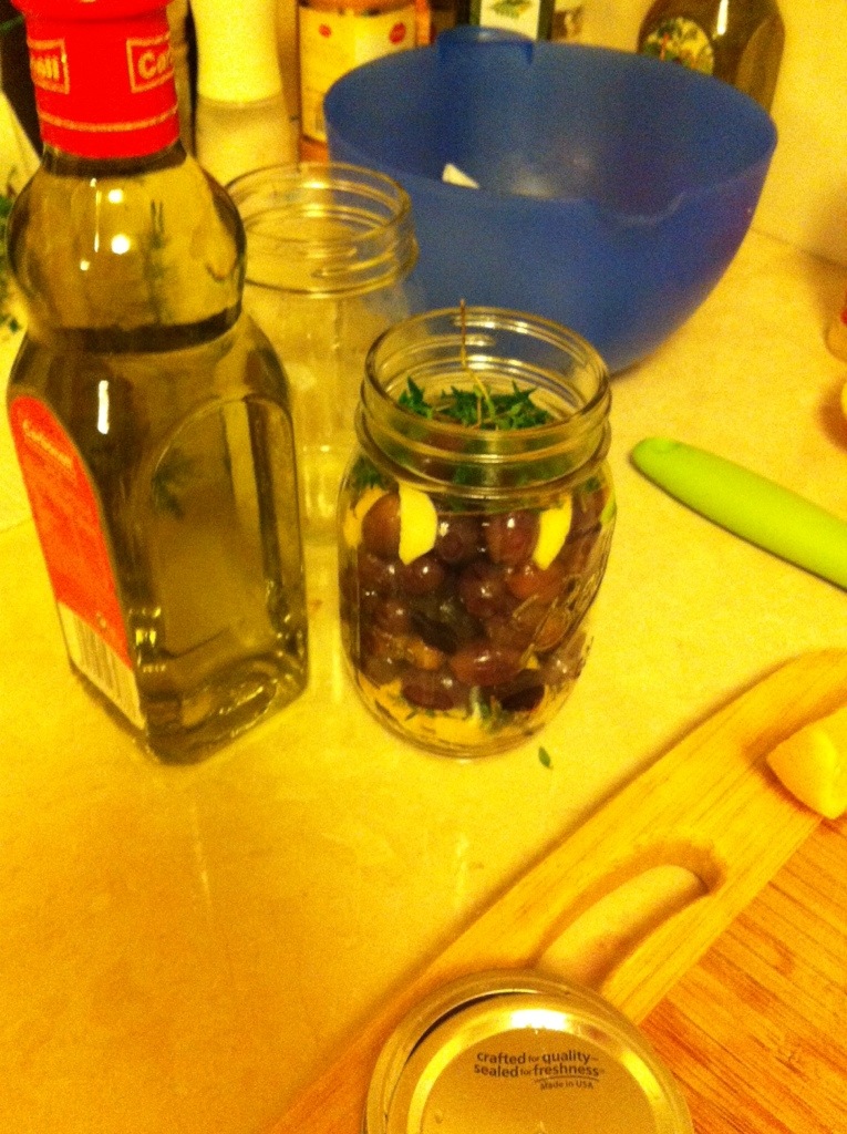 I made tofu again. Despite some early mishaps it turned out great. Also, transferred my brined olives to a garlic, lemon, thyme and olive oil marinade. And we ate the leftover taco rice for dinner. With some tofu. Yum!