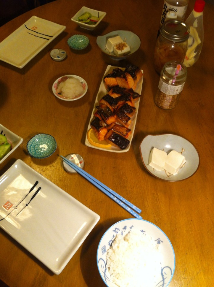 Tonight, just for a change, we had Japanese again. Grilled salmon, tofu, rice, pickles. And I even had a bit of wasabi today 😄