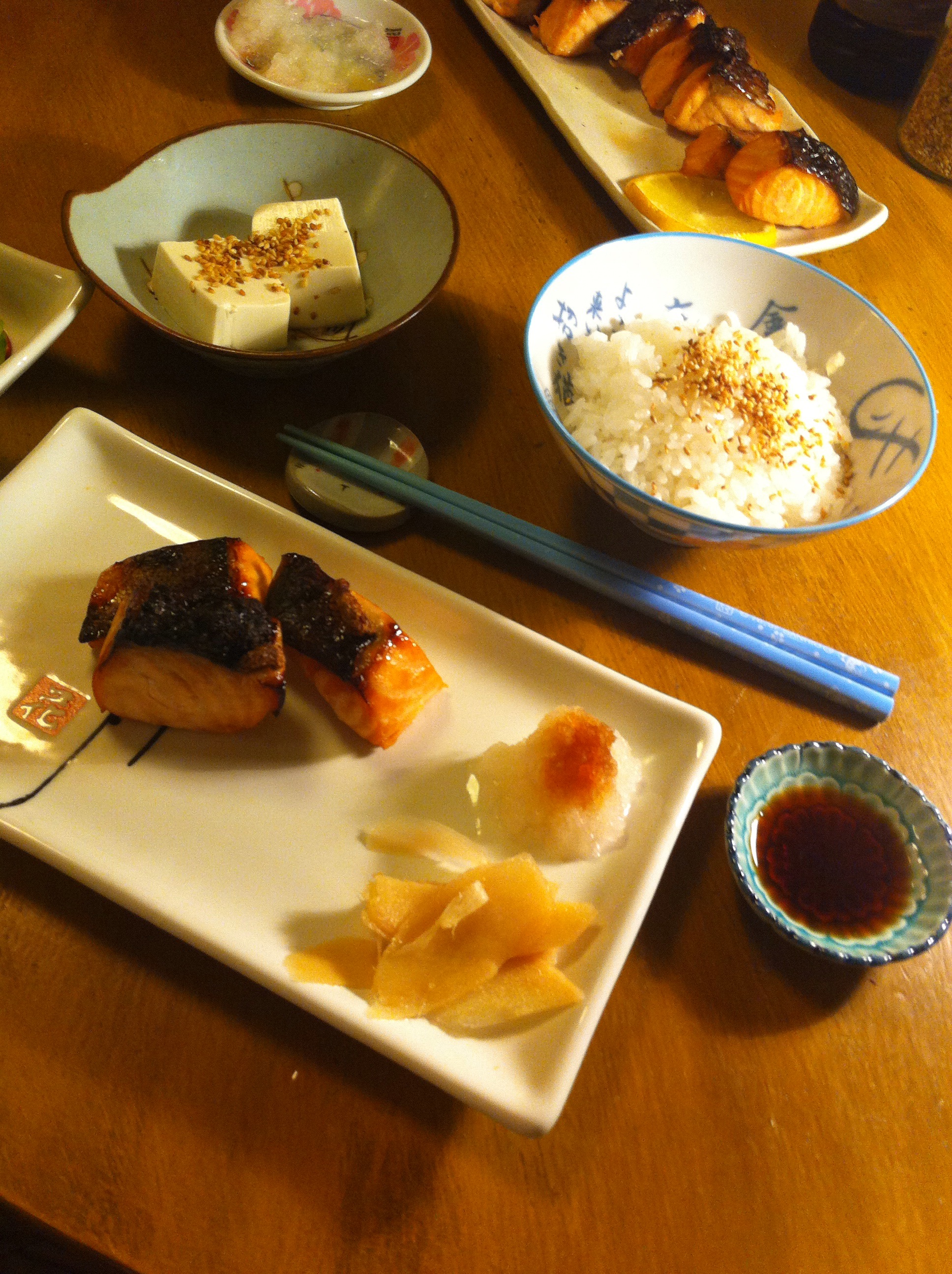 Tonight, just for a change, we had Japanese again. Grilled salmon, tofu, rice, pickles. And I even had a bit of wasabi today 😄