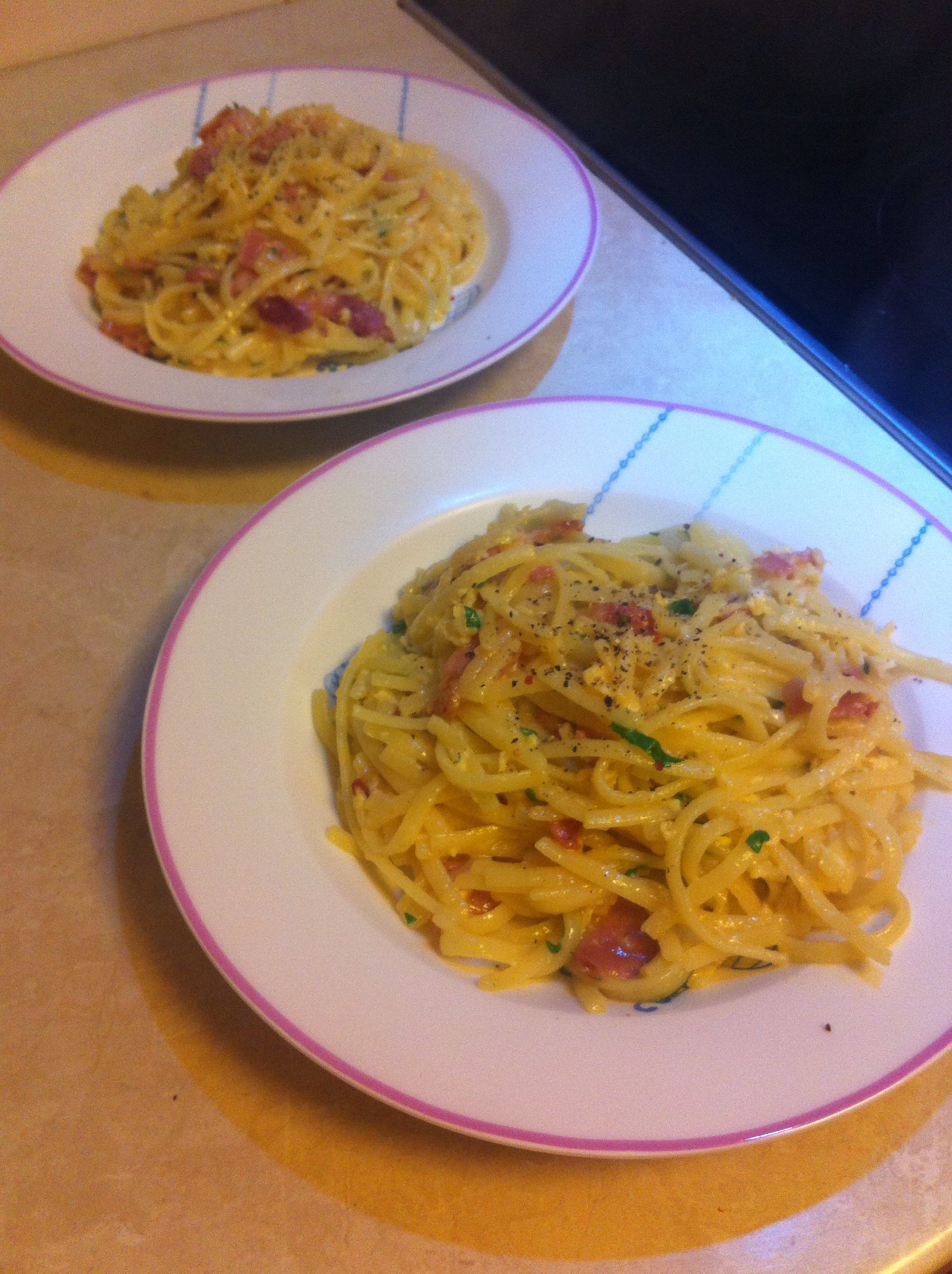 A quick meal of pasta carbonara before heading off to band practice.