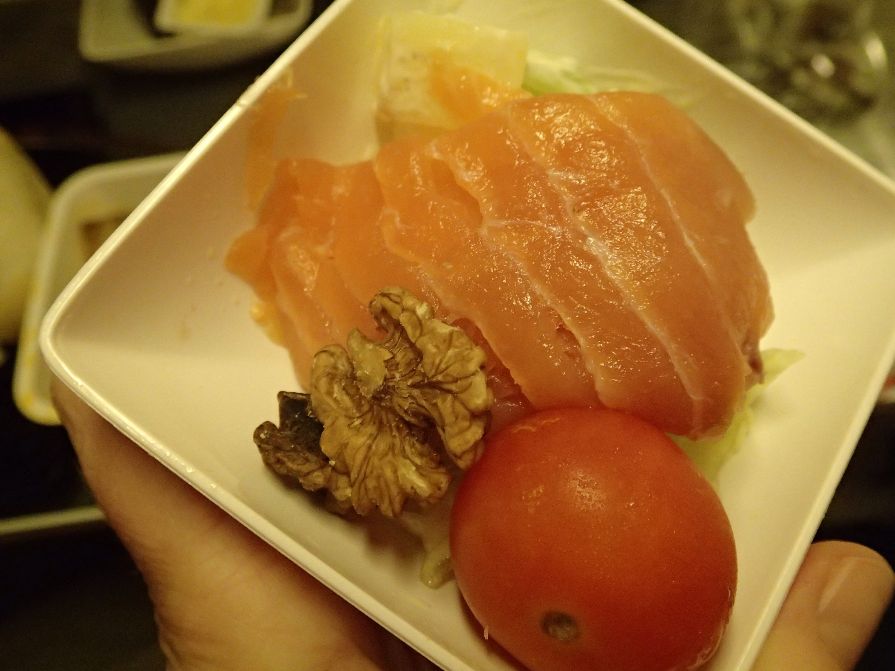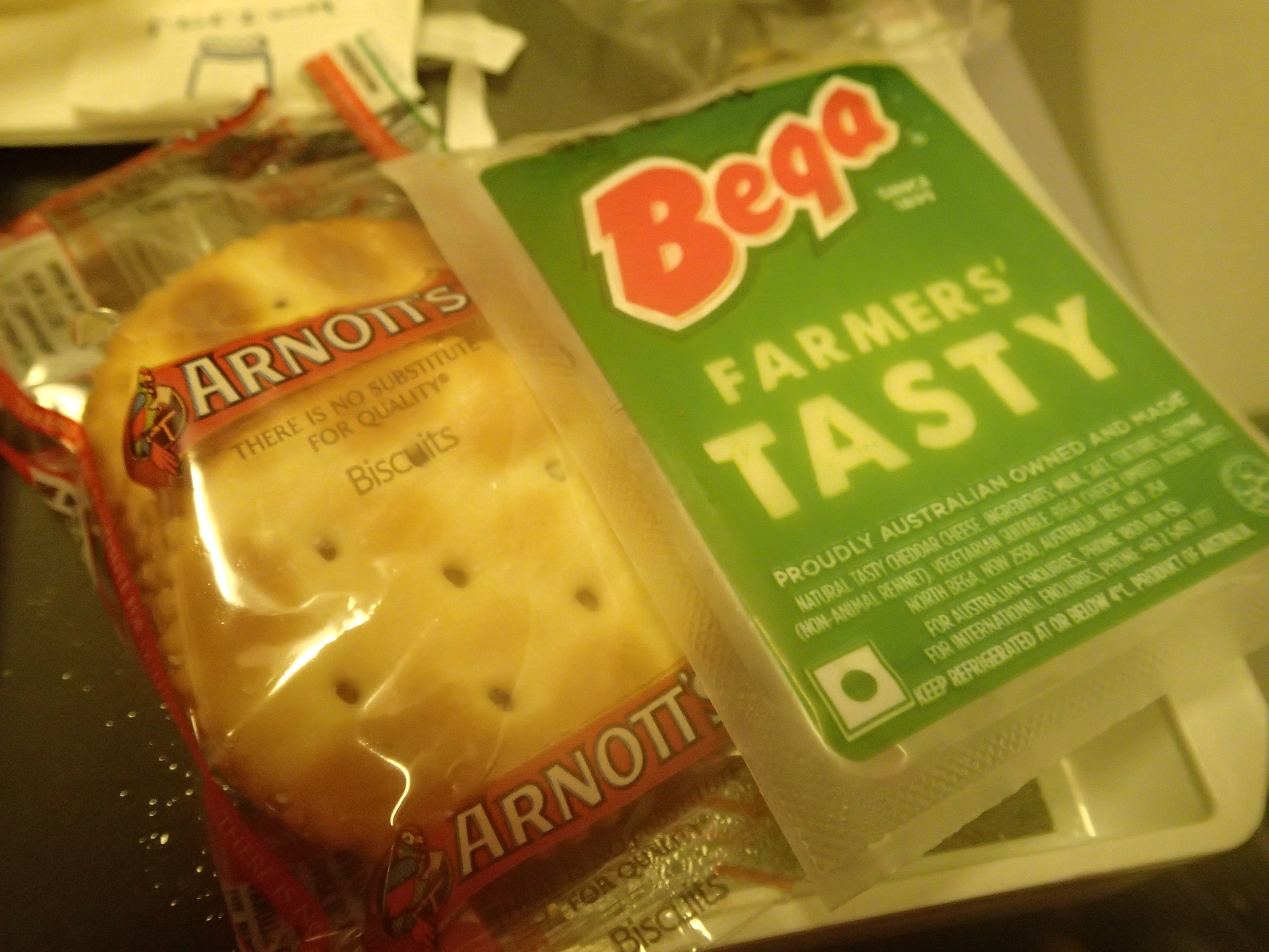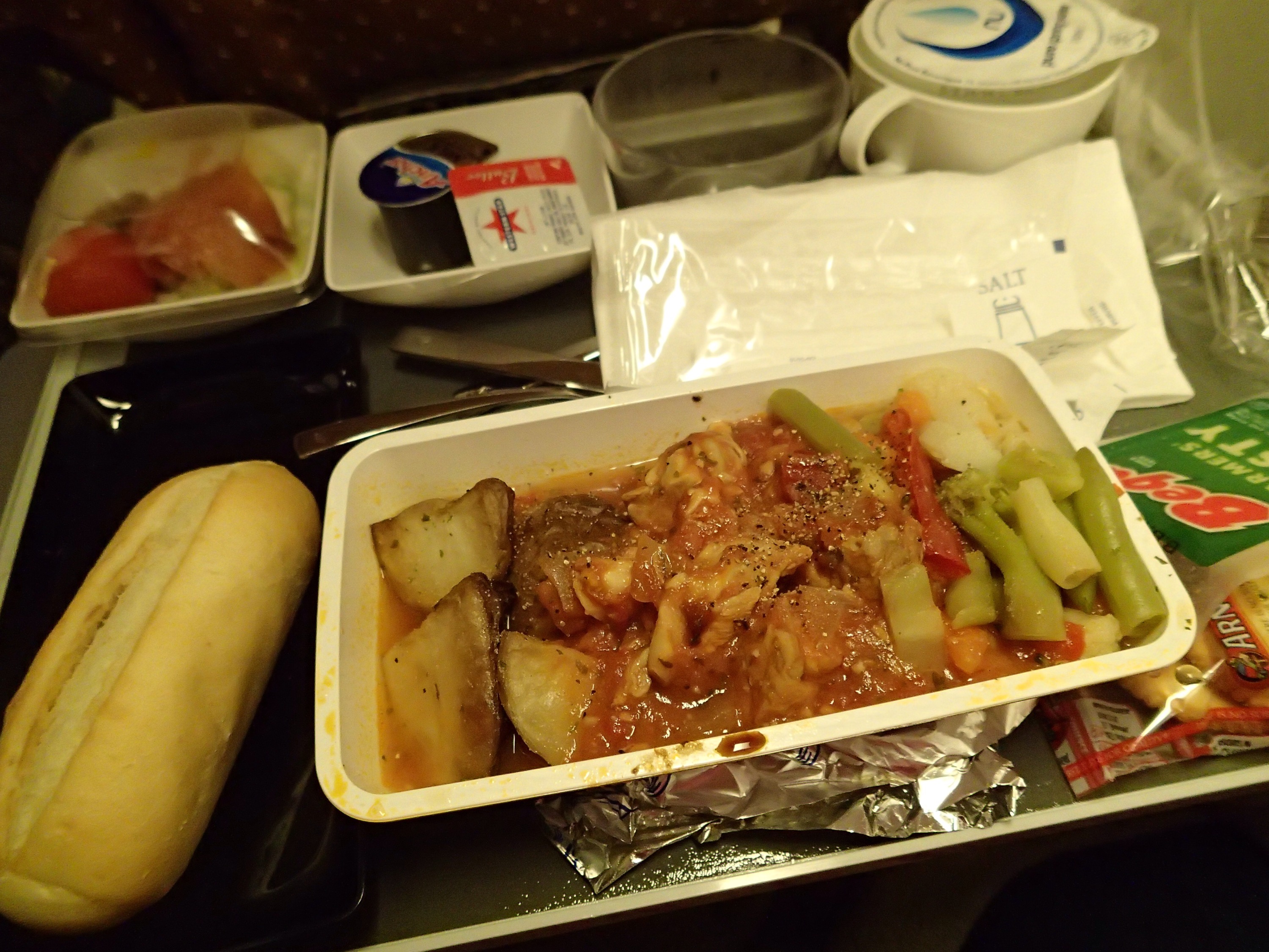 Tonight’s meal comes to you courtesy of Singapore Airlines. We were on route to Singapore. Our flight left just after 5pm – and I was hungry then. Didn’t end up getting fed until around 8pm – man, I was so starving! I do generally like aeroplane food (yeah, I know, I’m a sicko), this meal was average, but I was sooooo hungry that I devoured it all. The highlight was the salted caramel Icecream for dessert.
