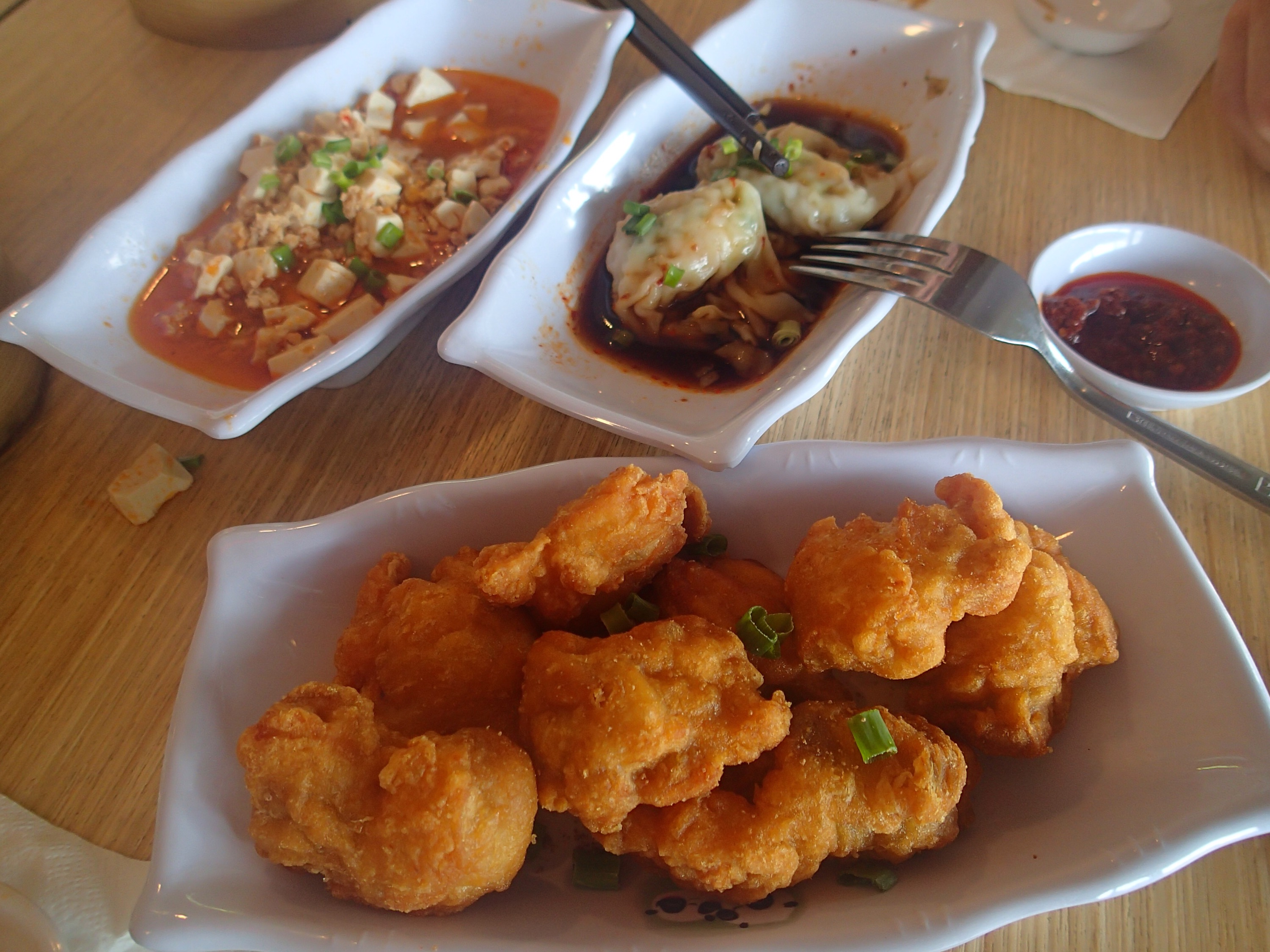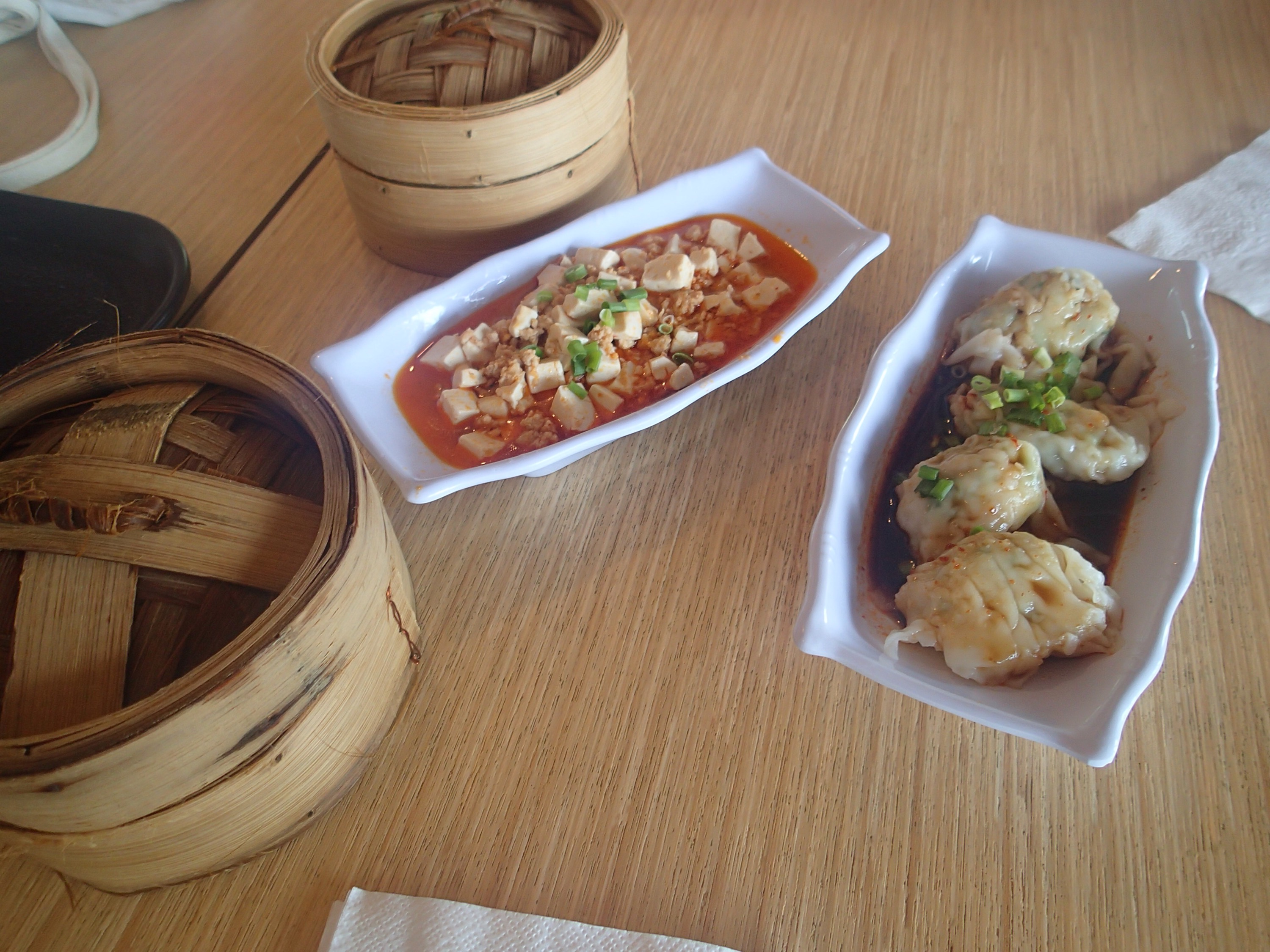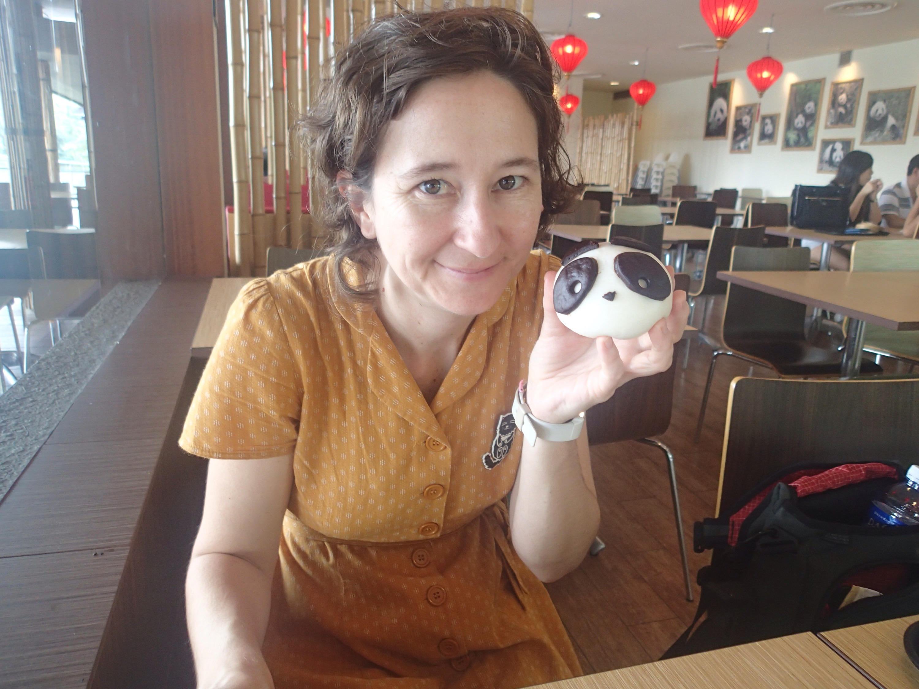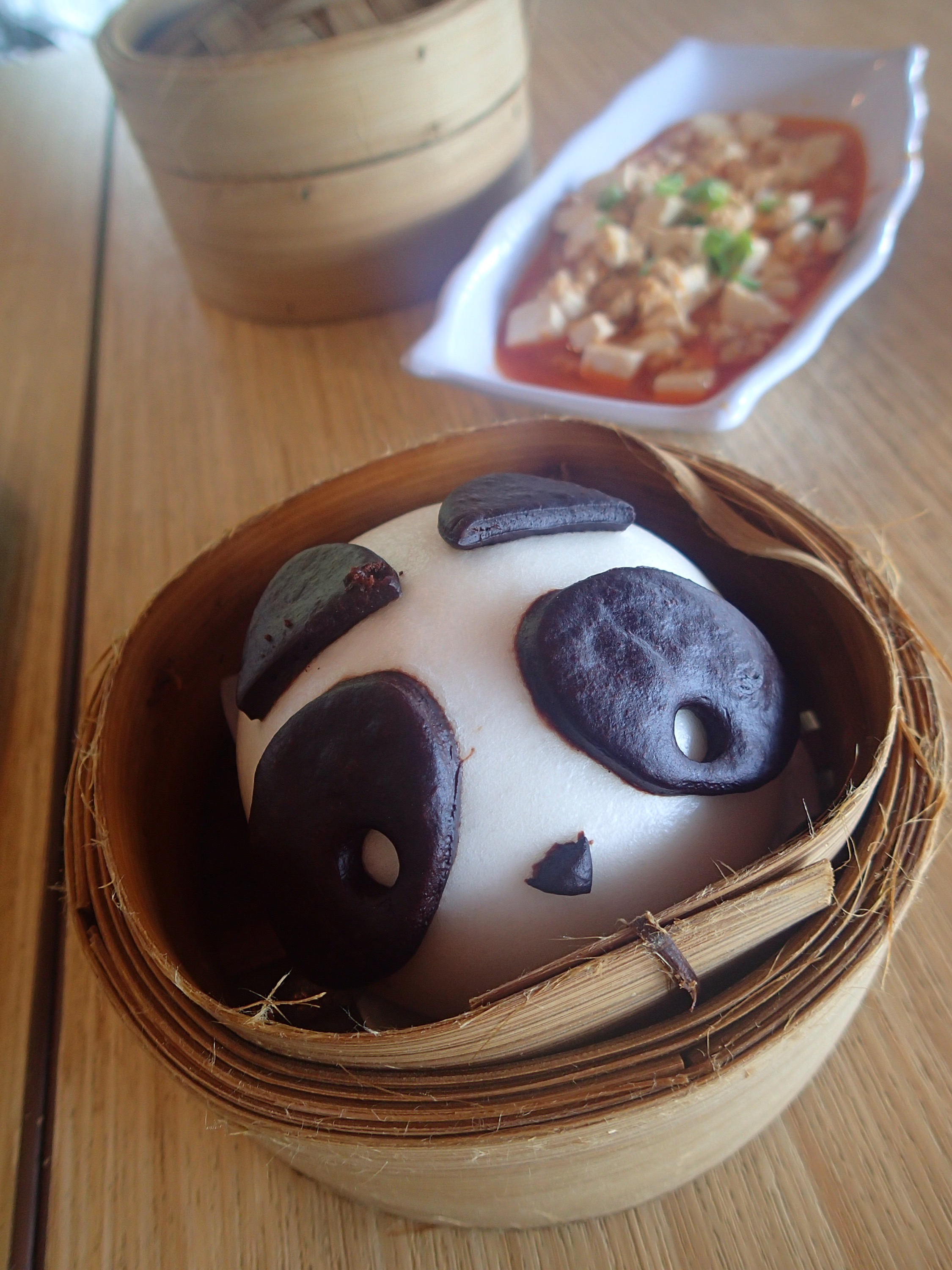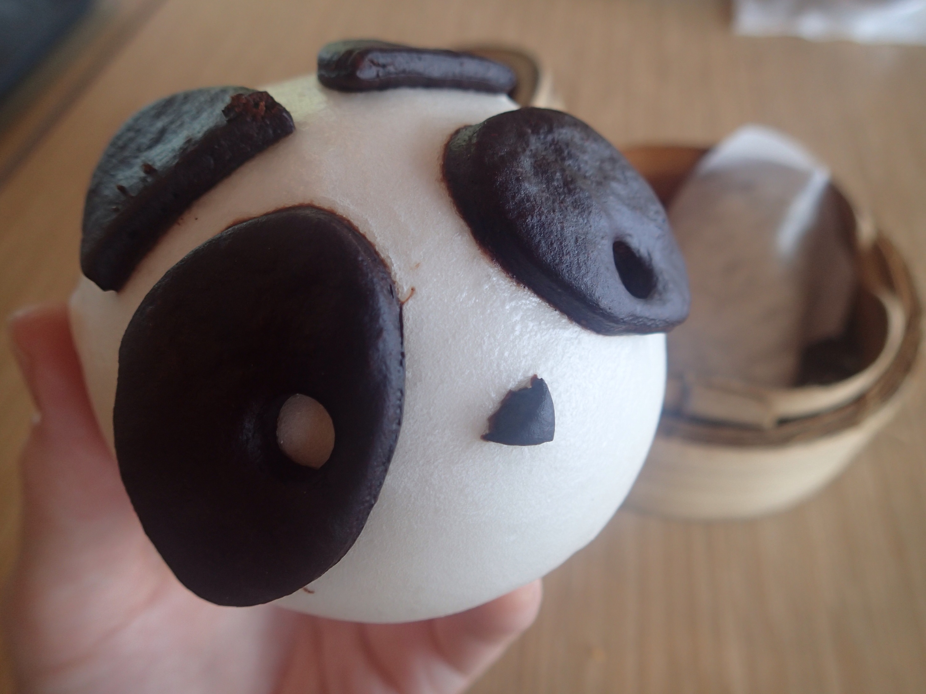 For lunch we had some fairly average fast food Chinese – crispy (microwaved) Chicken, Mapo tofu & dumplings. But look, we all know we weren’t here for that. It was the Panda bao dumplings that brought us (well, ok, mostly me) here. They had 2 types – red bean and chocolate custard. We both got red bean. They were so cute, and pretty darn tasty too!