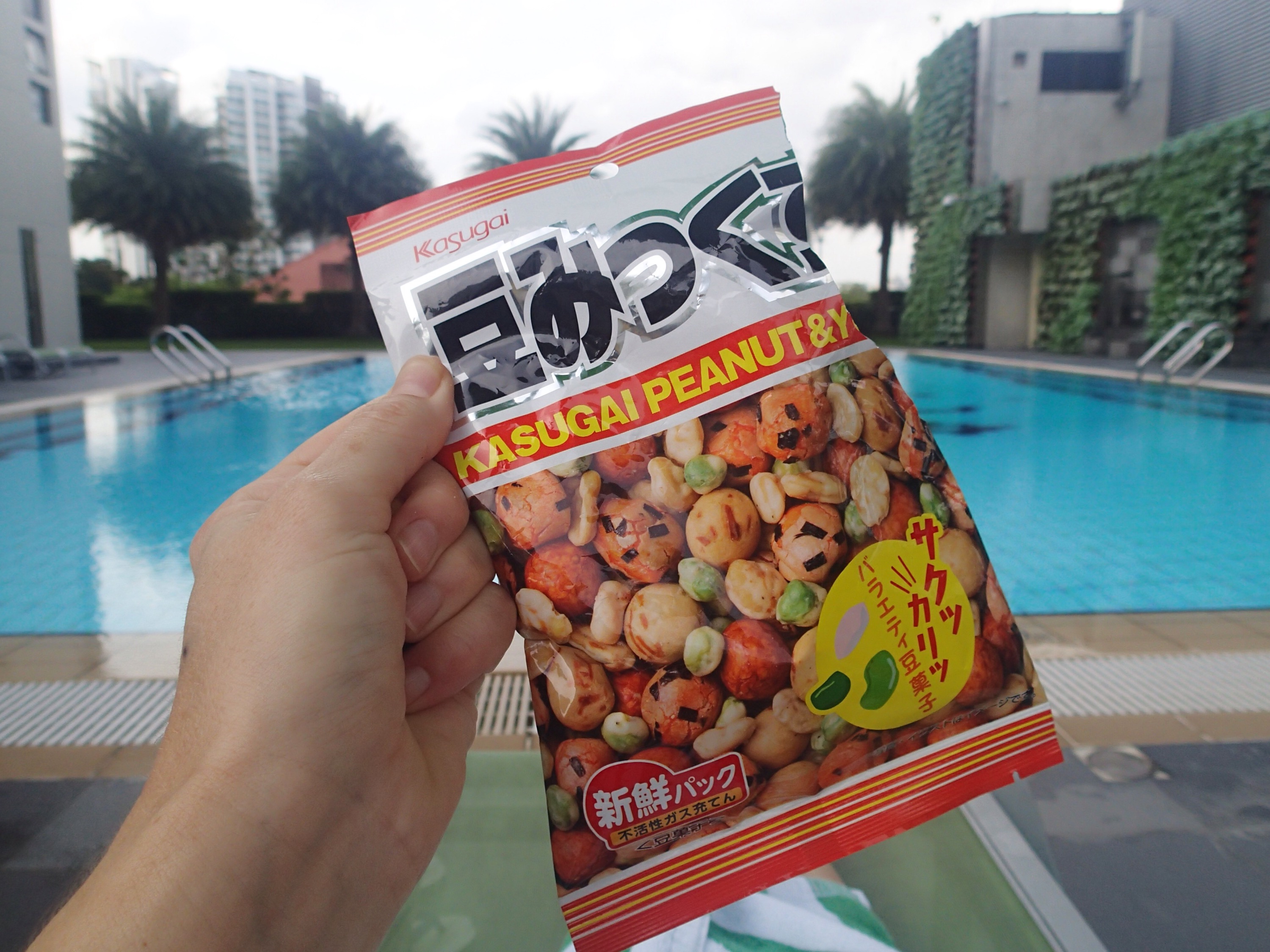 Afternoon snacks back at the hotel by the pool – mangosteen, beer and Japanese rice crackers.