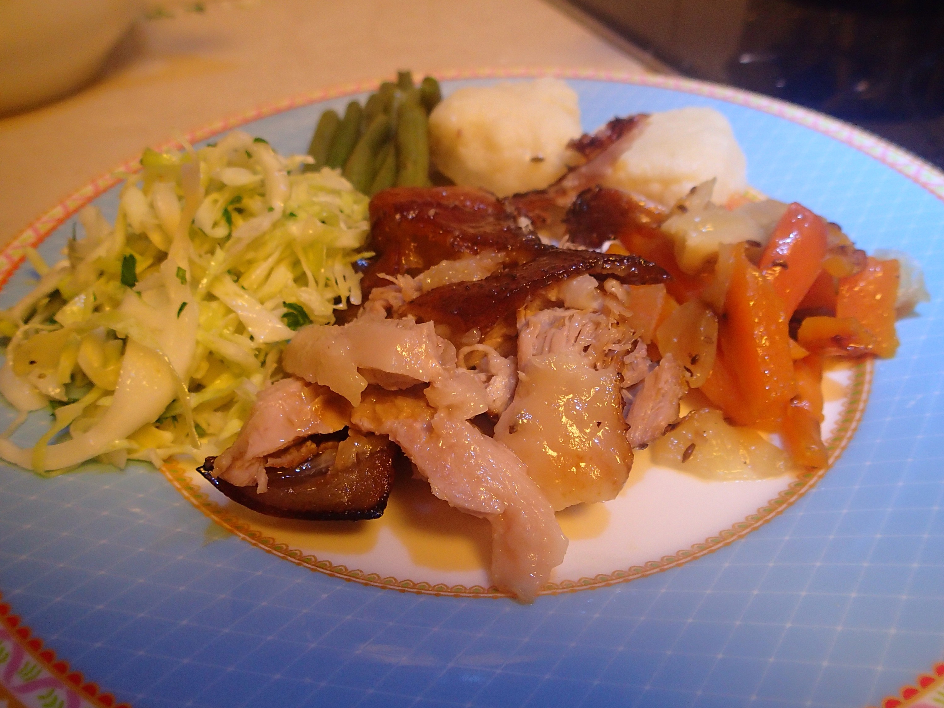 I also made a kraut salat, green beans and potato knoedel. Unfortunately, I was slightly distracted by an episode of Castle that was on TV whilst I was making the knoedel and I don’t think I made them as well as I normally do. Also, I accidentally put too much flour in the gravy (I blame Castle again) and thus made it too thick and floury. That’ll teach me for trying to watch TV and cook.