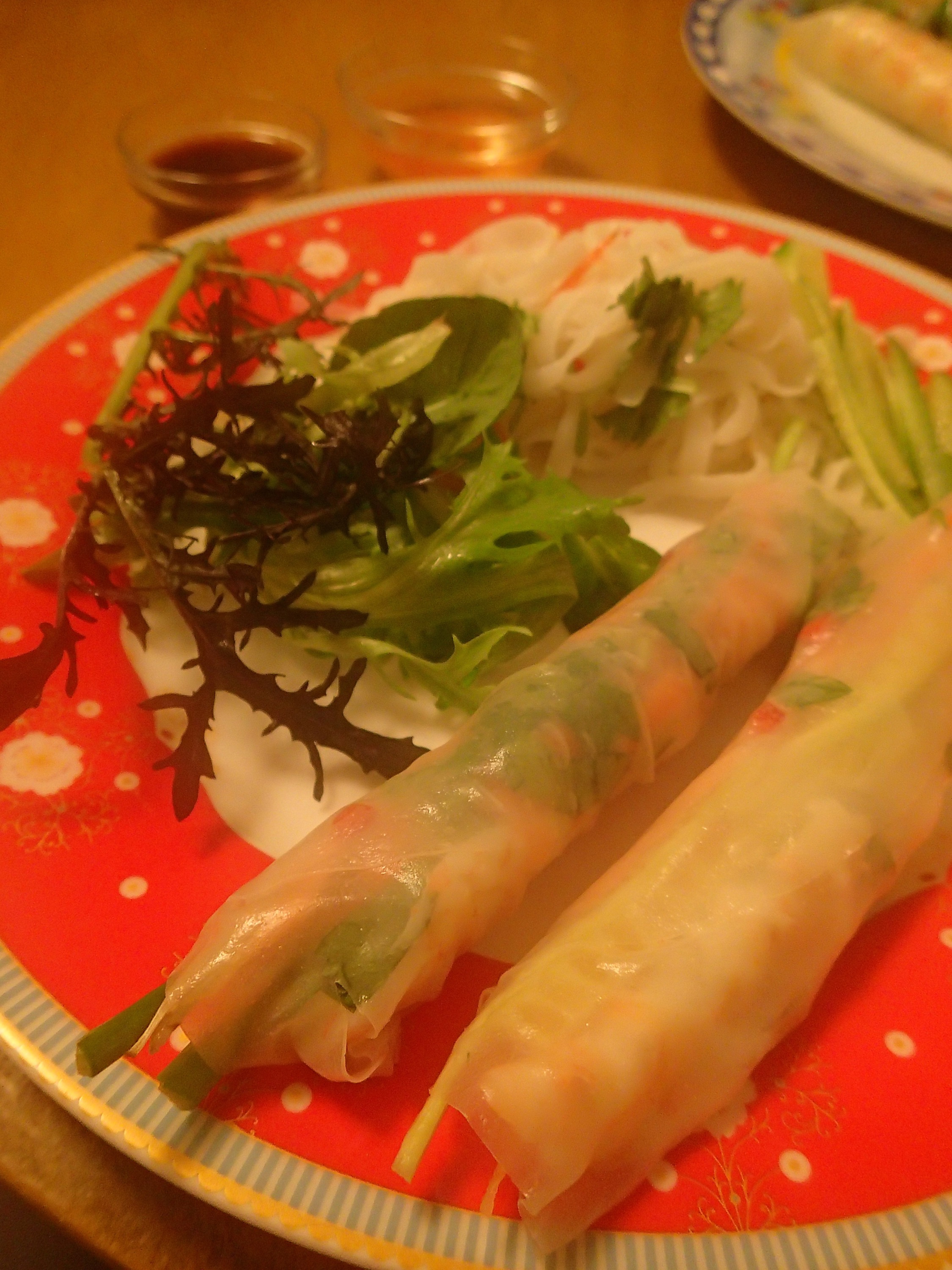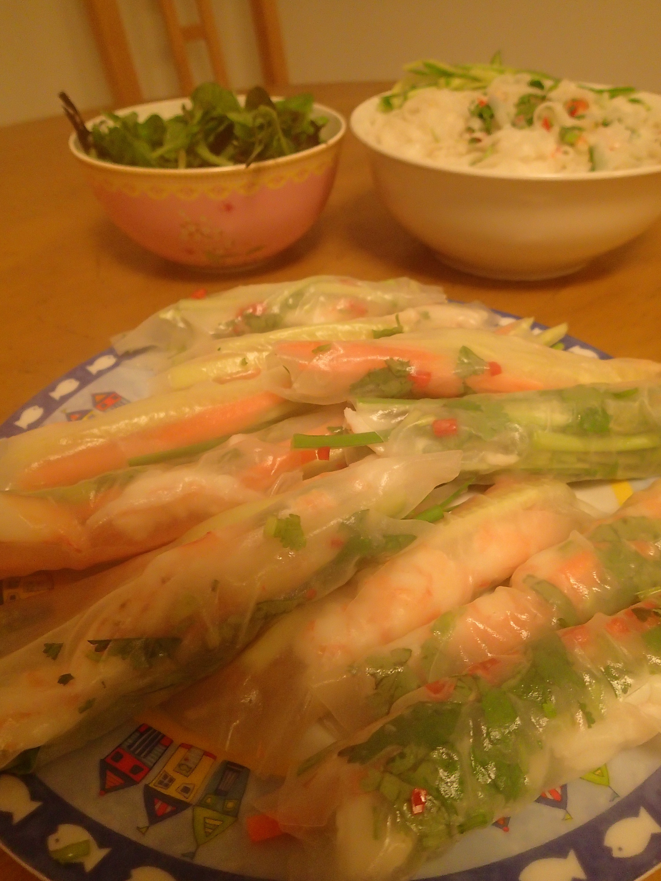 In hindsight, this was probably more of a Summer meal, but it was still tasty. Rice paper rolls with prawns, coriander, chilli, cucumber, carrot, chives and bean sprouts. With a rice noodle salad. A nice light and fragrant meal.