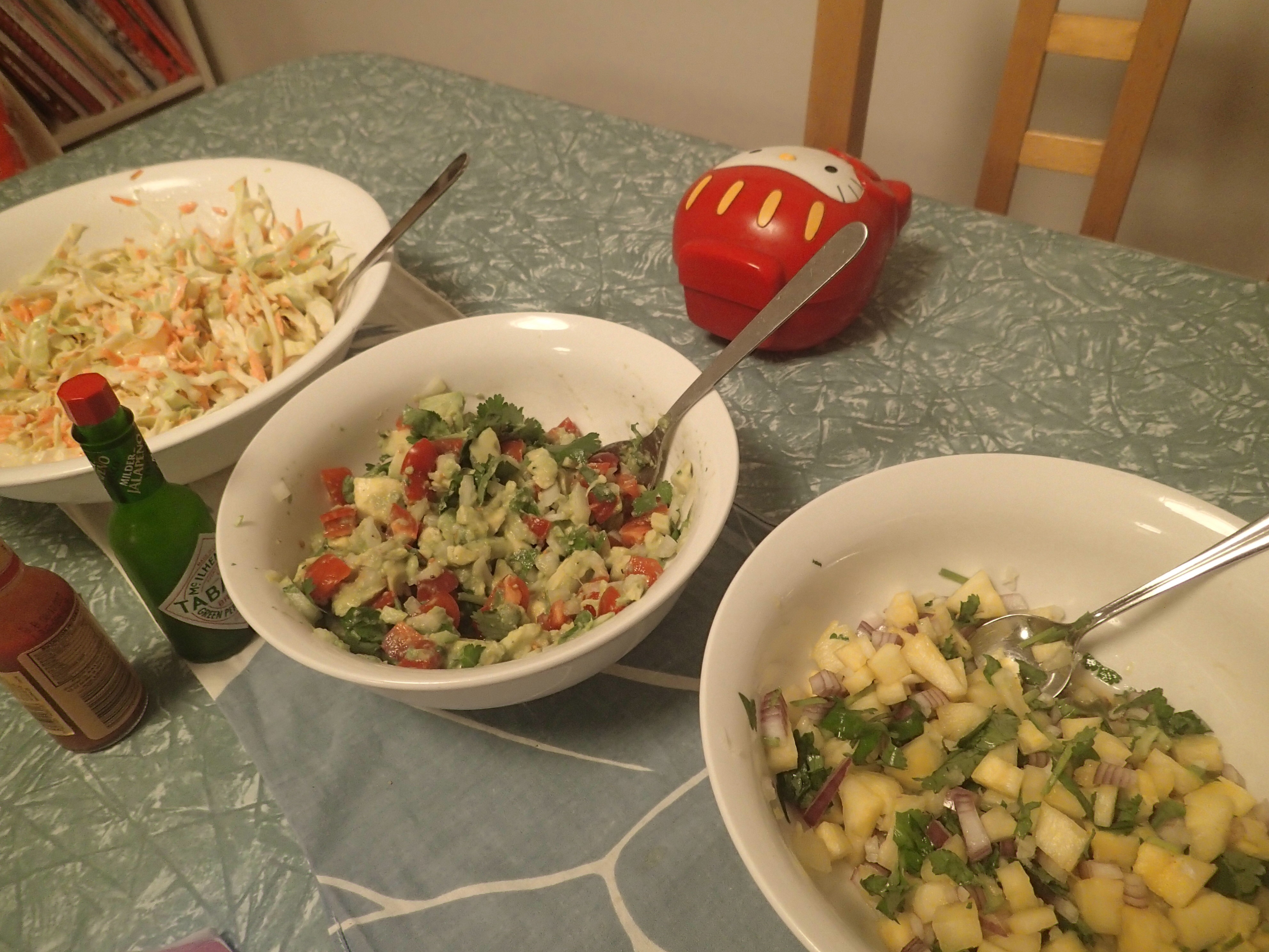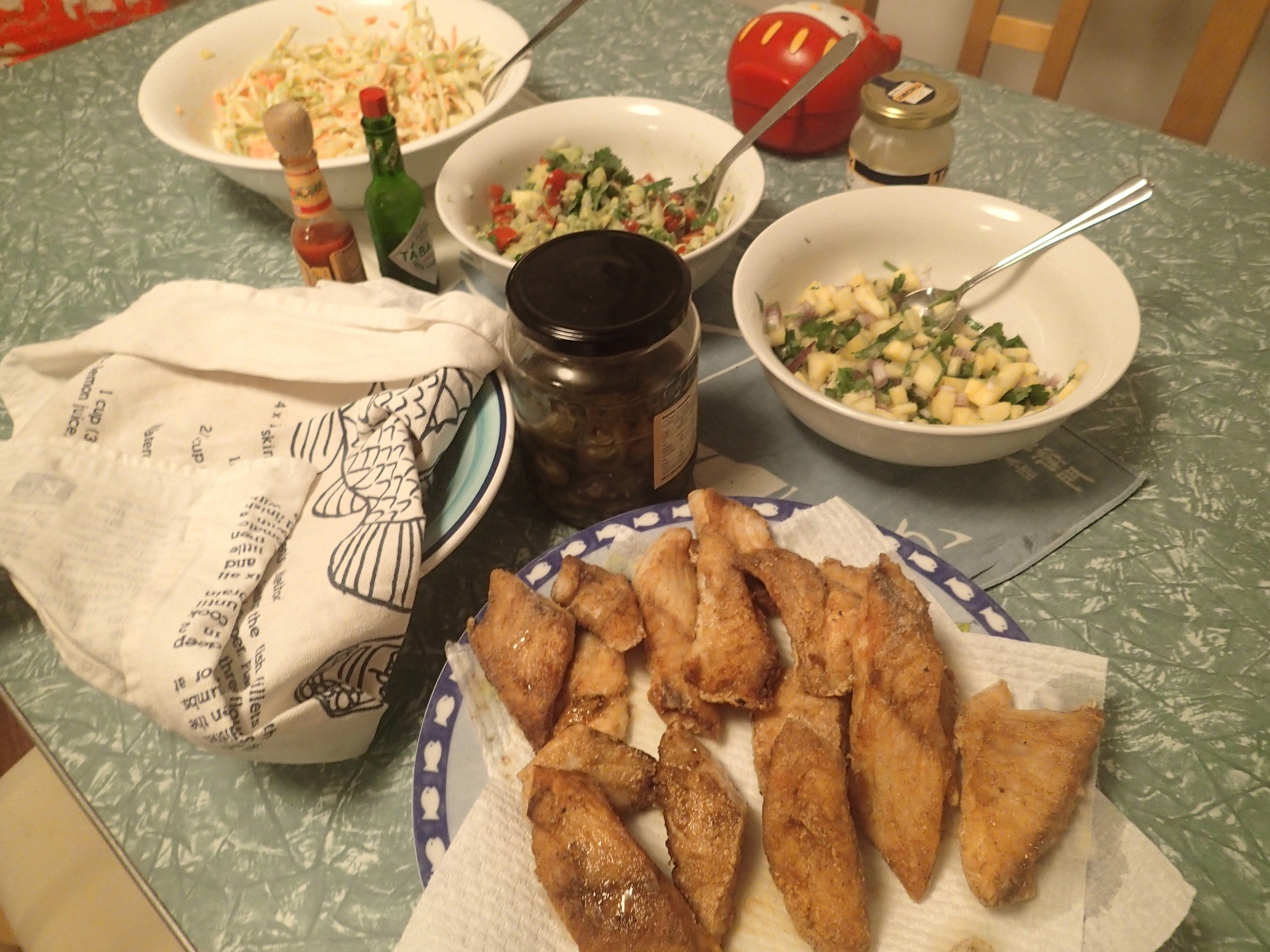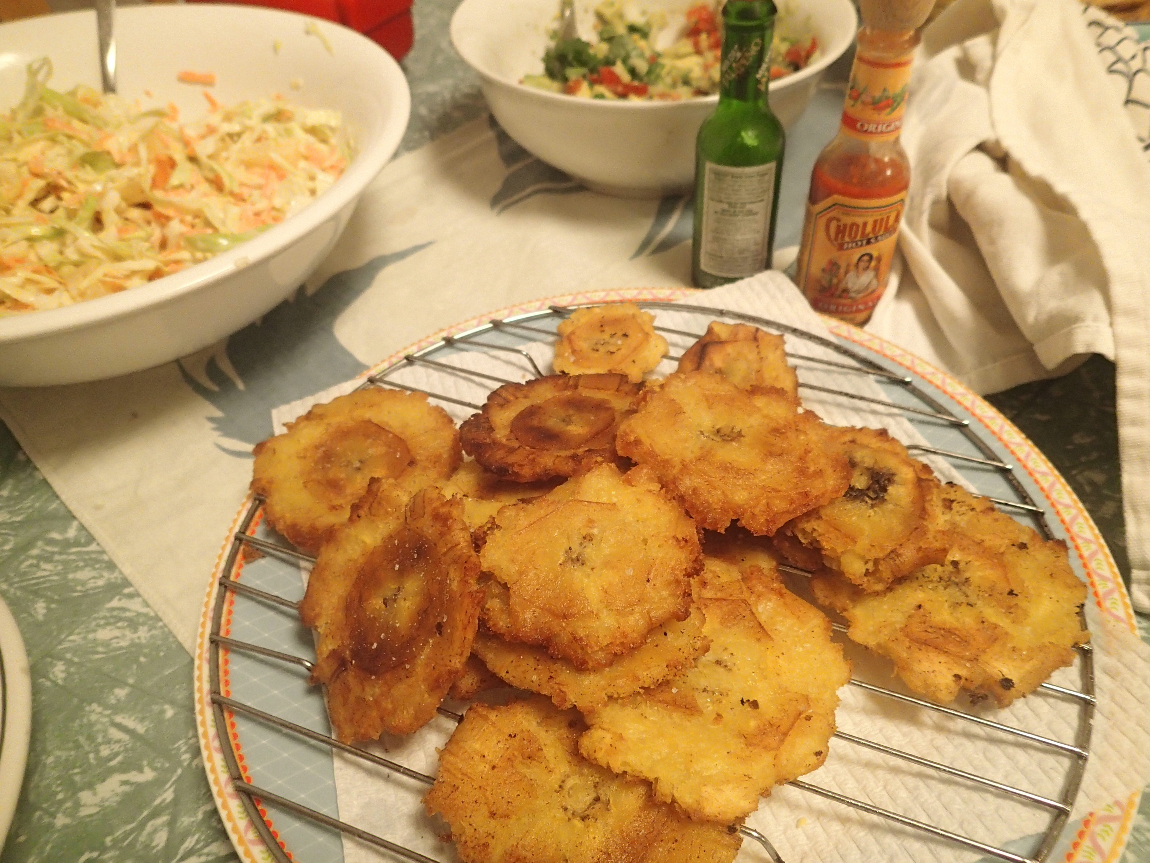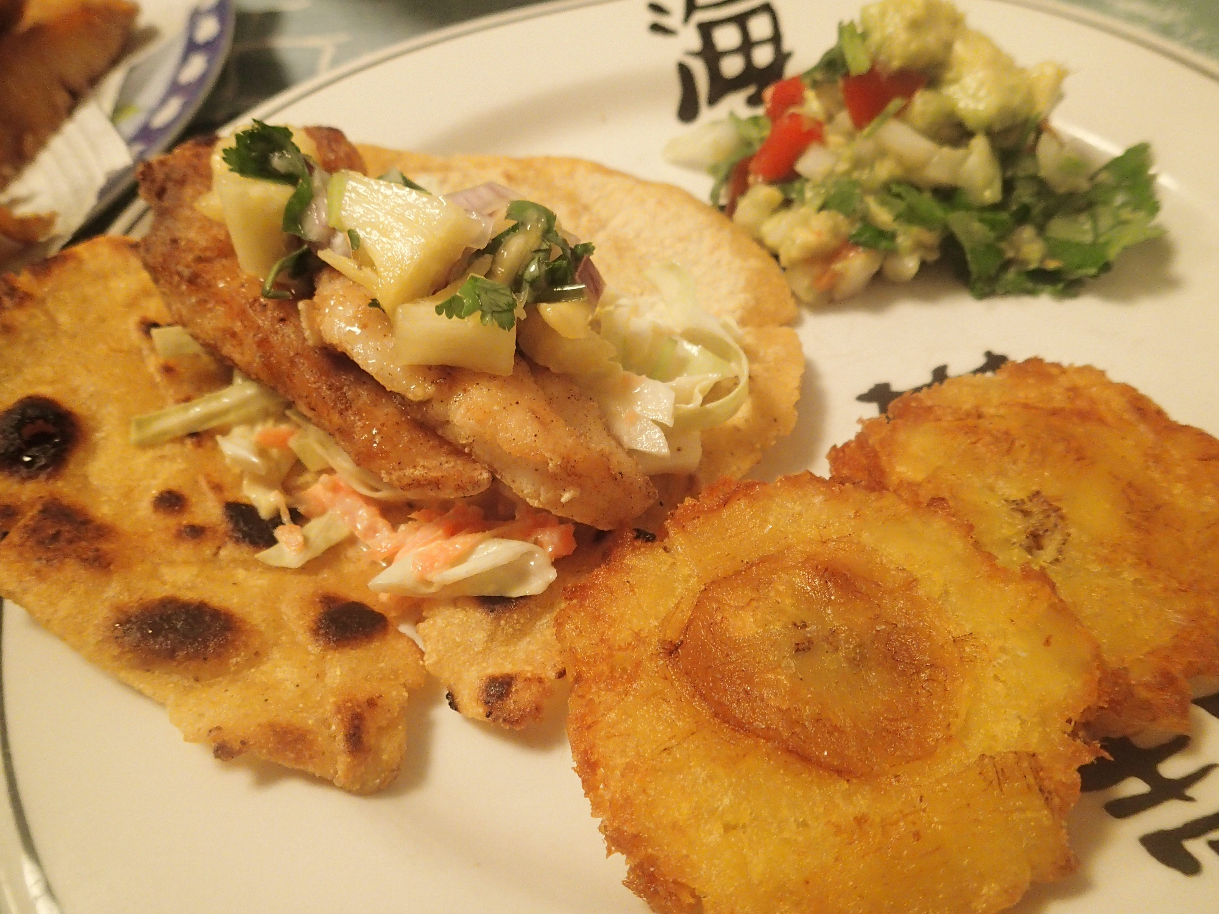image image image image imageStill feeling a little under the weather today, but dinner made me feel a bit better because it was so good! Our favourite vege store (Innaloo Fresh) randomly had plantains in stock when we were shopping there on the weekend. I didn’t waste any time snapping a couple up. I’ve never seen them in Perth before, and thus have never cooked them before. As I was busy making salsas – guac, pineapple and coleslaw and making fresh tortillas for fish tacos, I made Steve cook the plantains. They are sliced, peeled, fried, flattened, dipped in salt water and then fried again. And they were crispy and delicious! The fish was Mangrove Jack from Catalano’s and it was spectacular. Yum!