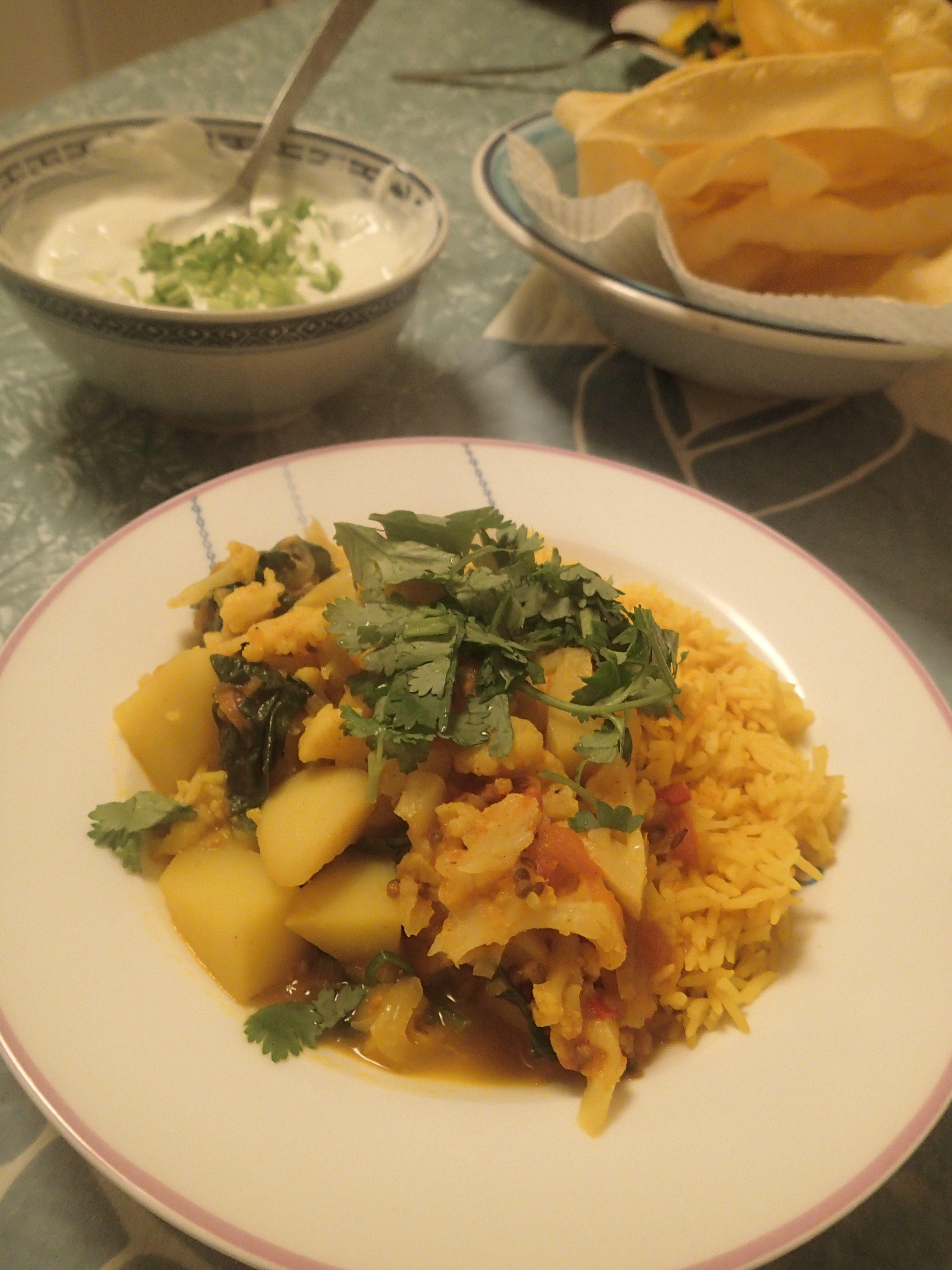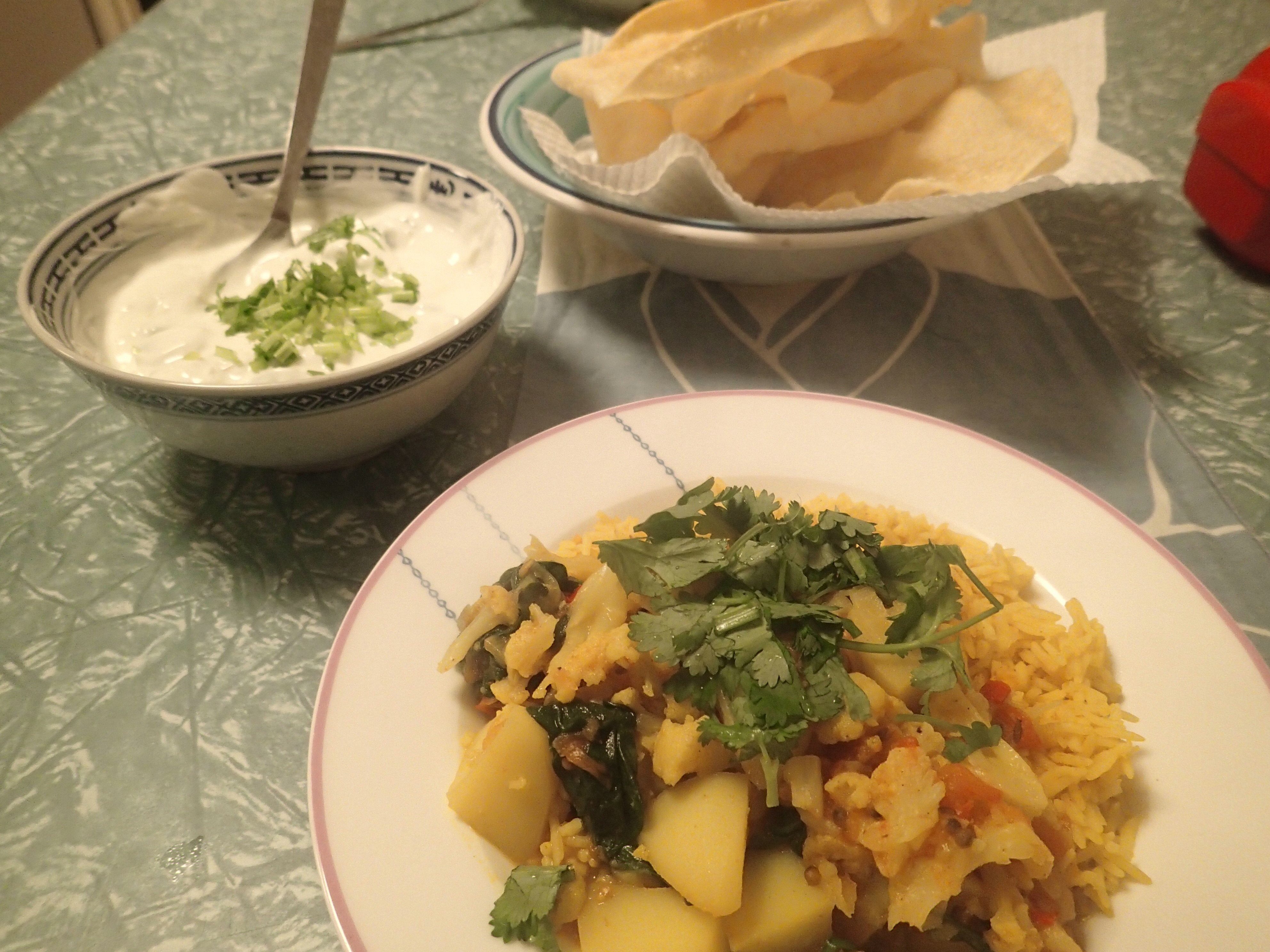 Tuesday I made a potato and cauliflower curry with a garlicky cucumber raita. Trying to kill some germs.
