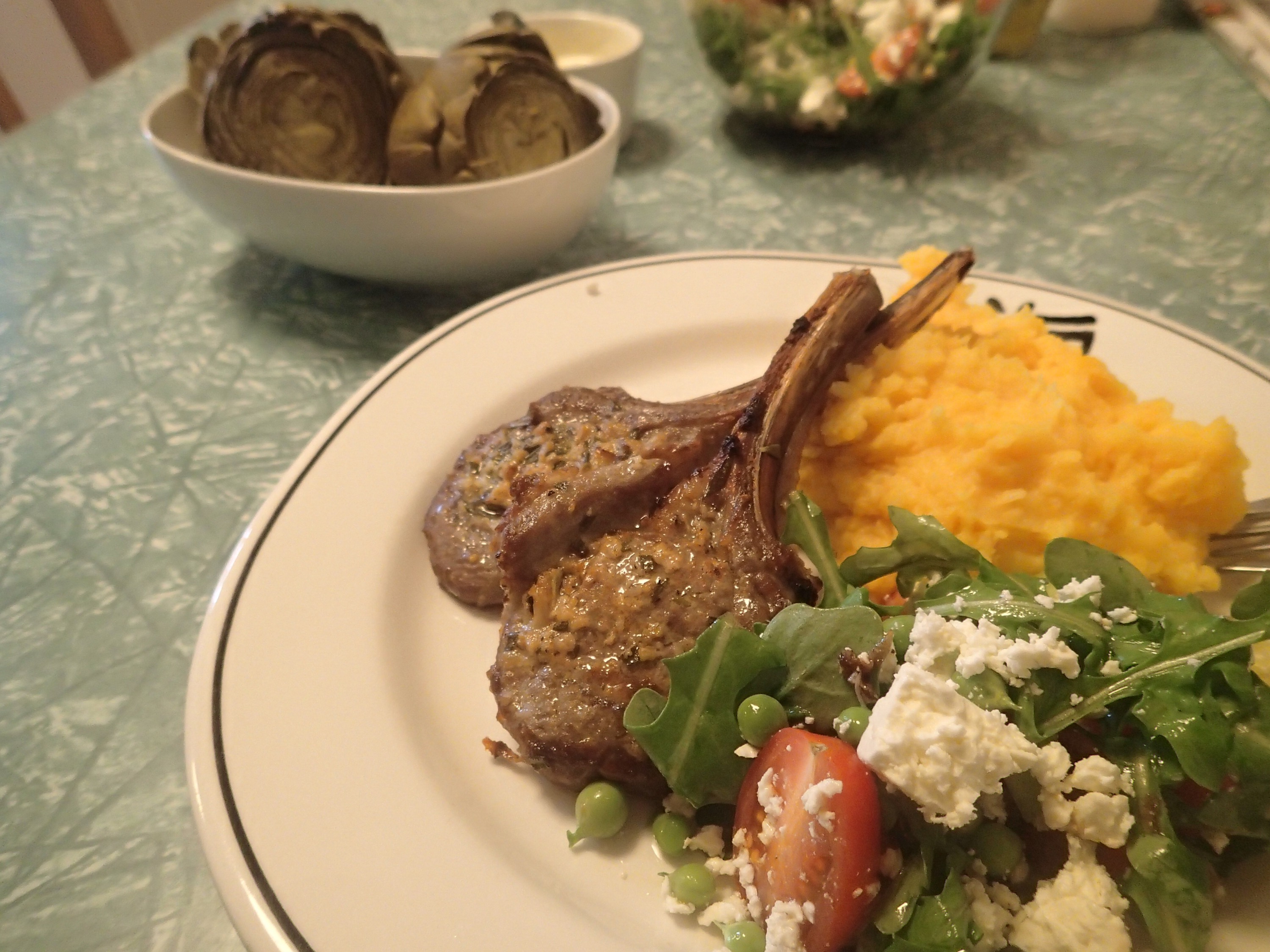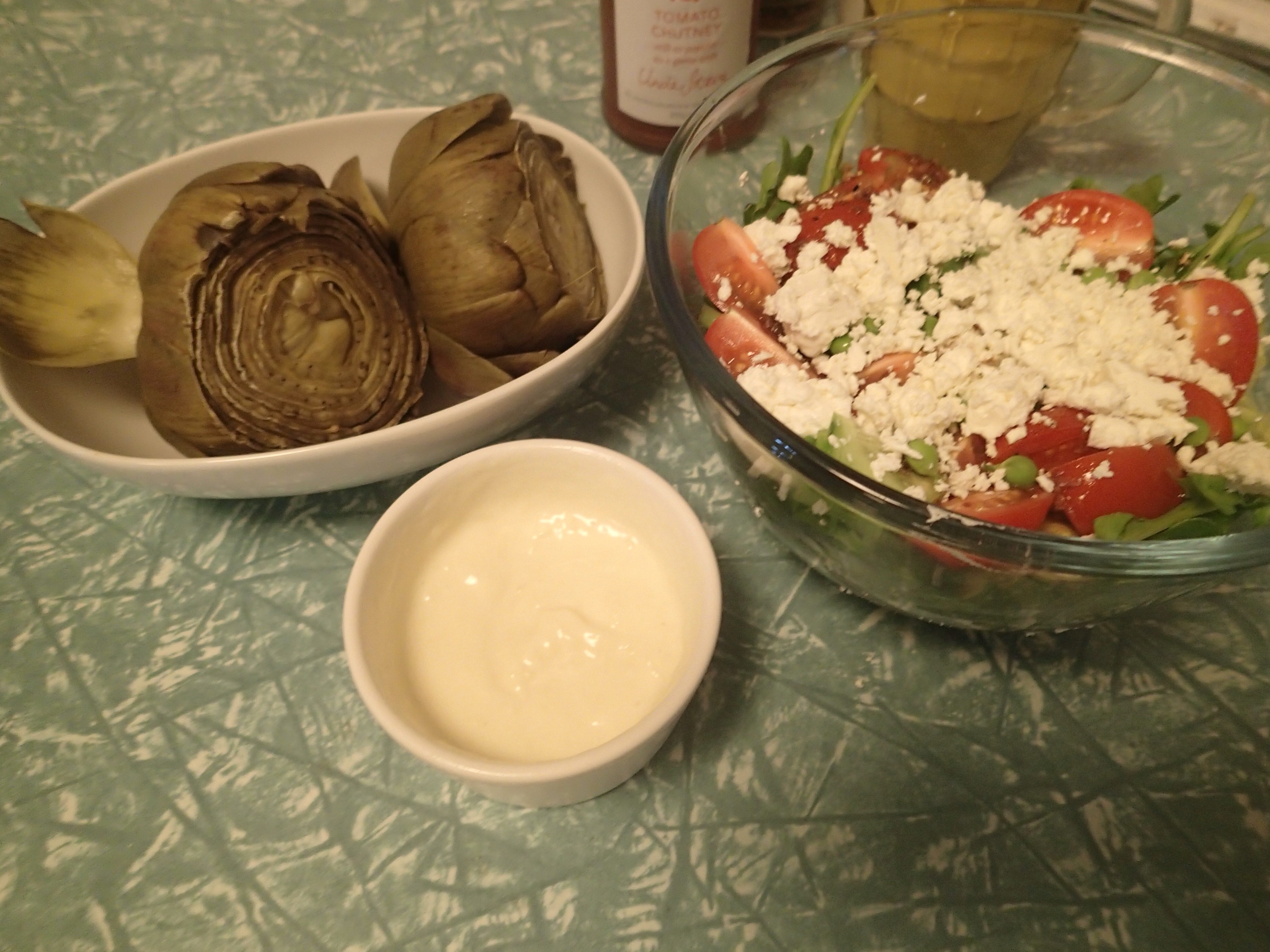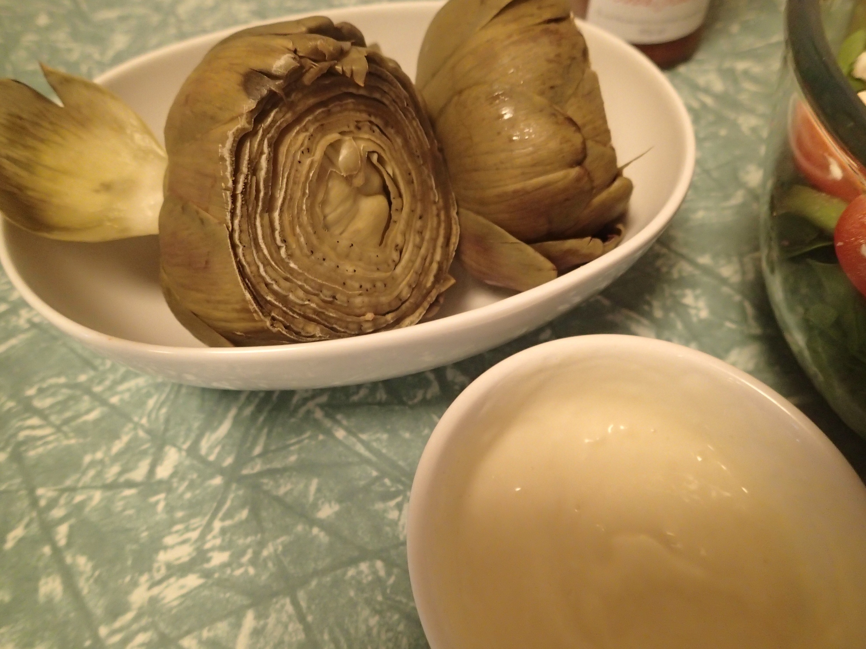 Artichokes. Bought some artichokes the other day. Wasn’t quite sure what to do with them, but after a quick search of the Internet I discovered that they were quite easy to prepare. There are a few ways you can cook them, but I opted for steaming them and serving them with some garlic mayonnaise. I also made pumpkin and potato mash and lamb chops.
