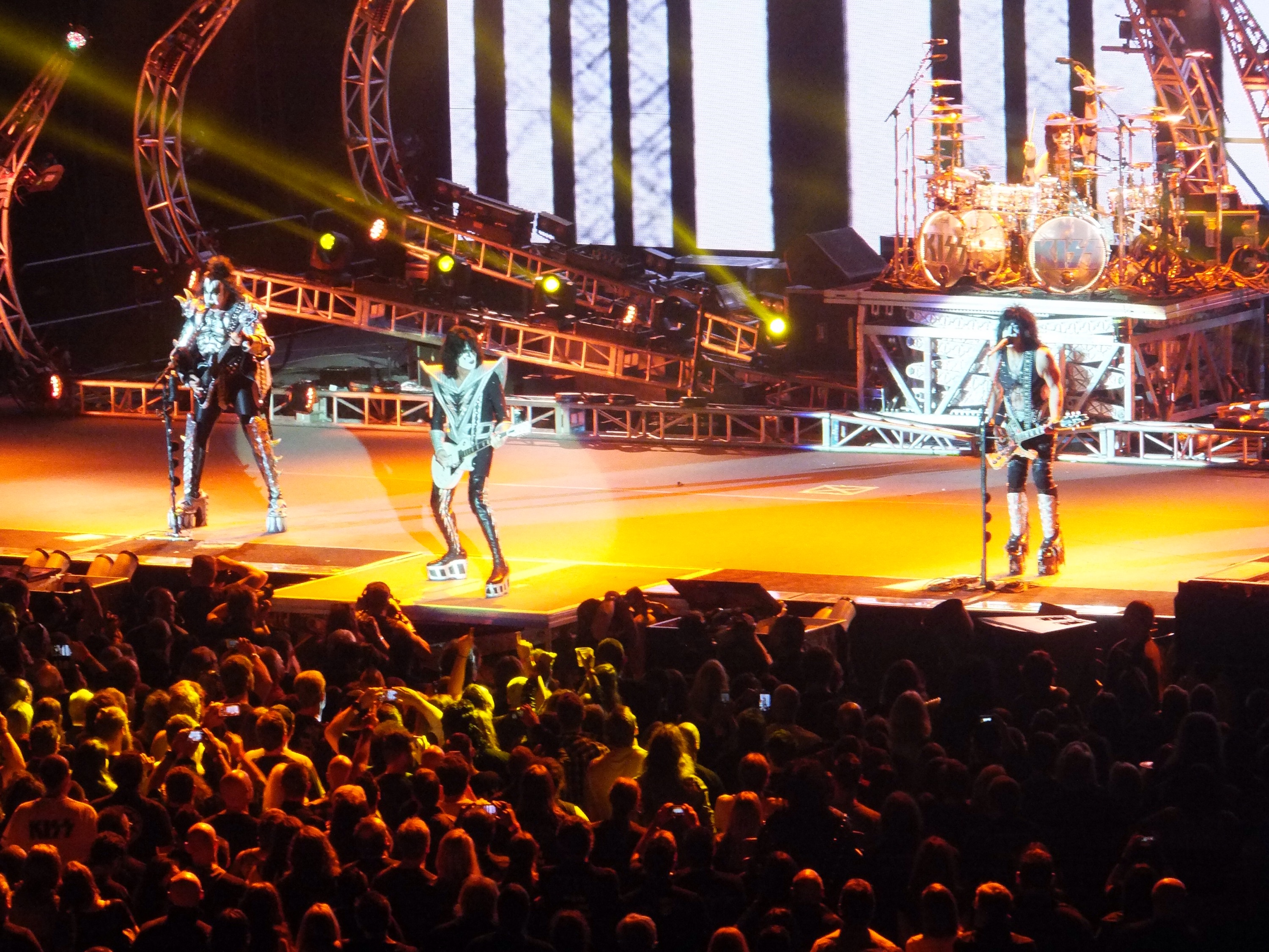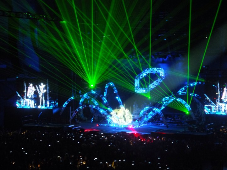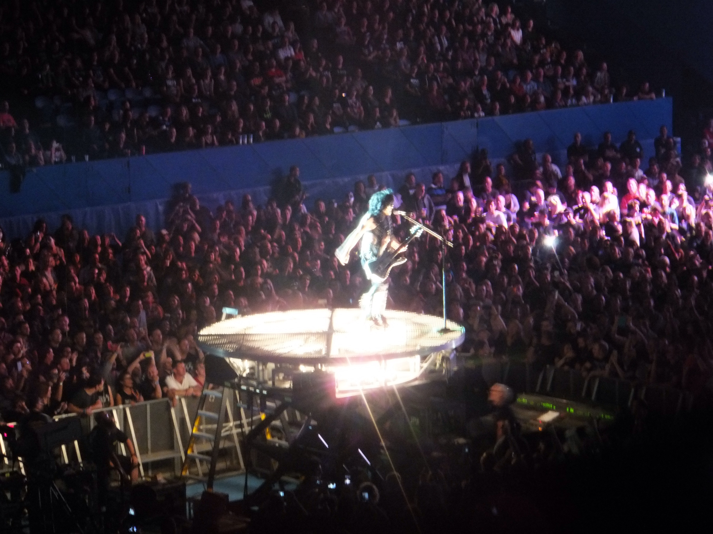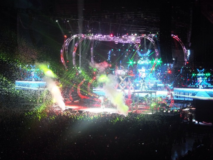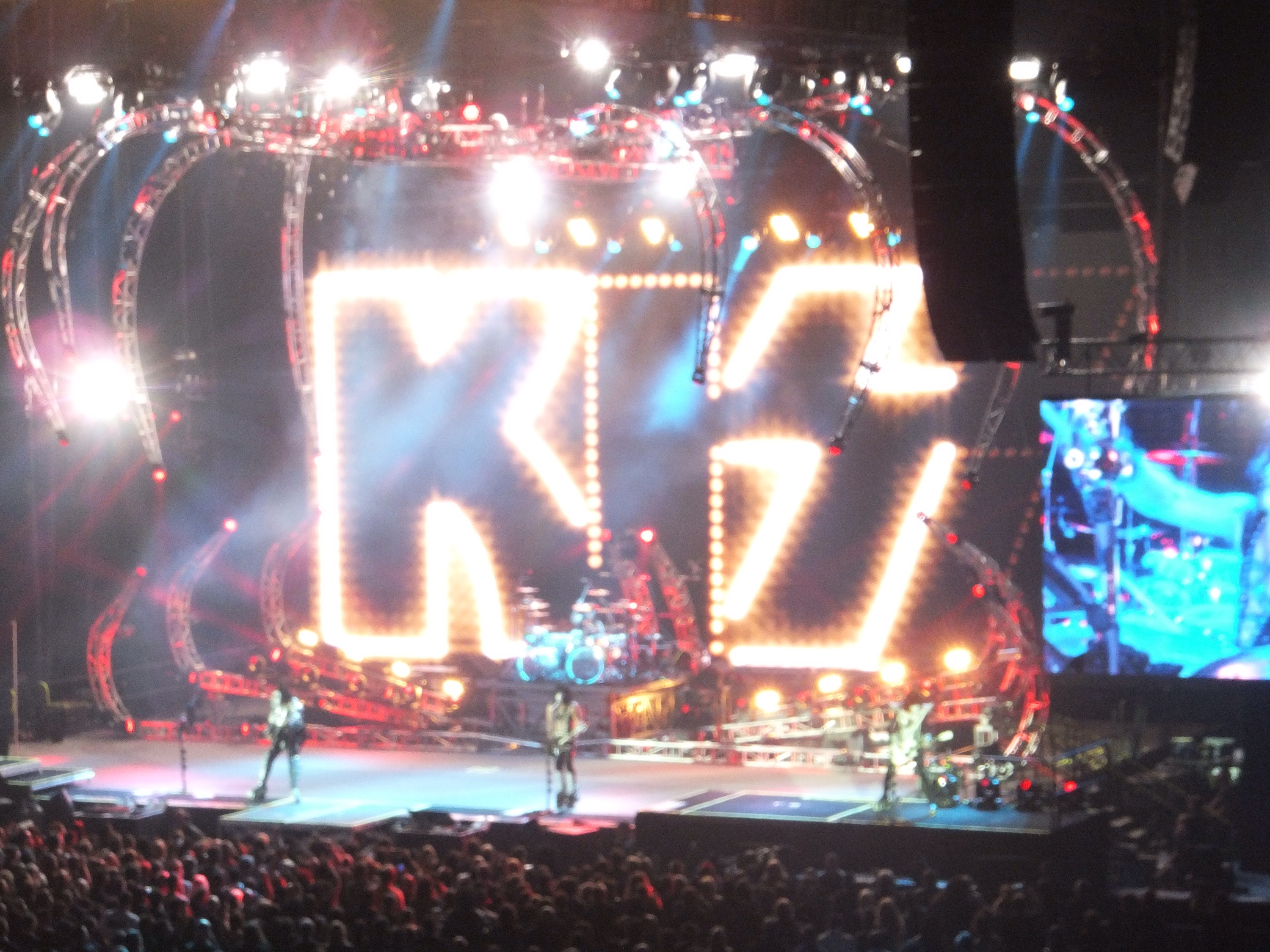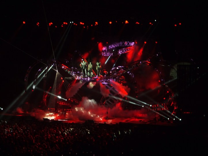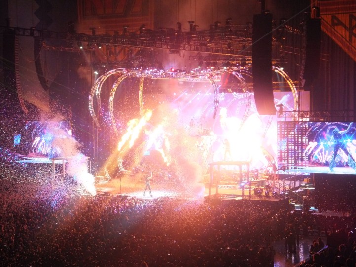 Kiss didn’t disappoint. It was all quite spectacular. They rocked hard and there were fireworks and smoke and lights and lasers and all sorts of craziness. At one stage Paul Stanley flew out over the crowd on a flying fox type thing (with his guitar and all) on to a stage in the crowd that looked like a giant lazy susan. There was fire breathing and blood spitting from Gene Simmons. A huge “spider” rig with lasers that they would get lifted up on to. Amazing.