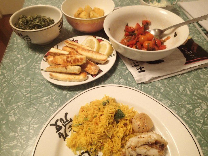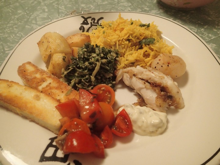 Had the leftovers from last night and supplemented it with a Basmati rice pilaf, haloumi and some creamed silverbeet (which was from our garden). This ended up being a really delicious meal.