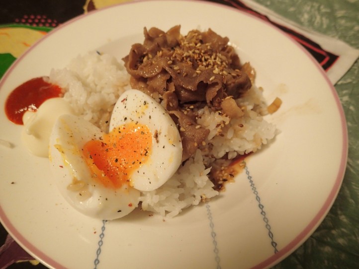 We eventually decided we had better have some dinner. Quickly cooked up some ginger pork with rice and an egg.