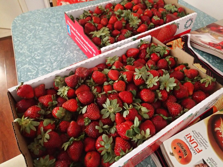 I started making strawberry icecream (from a really good Martha Stewart Recipe) but it was too hot for my icecream maker to work properly, so I had to put everything back in the fridge and freezer until tomorrow.