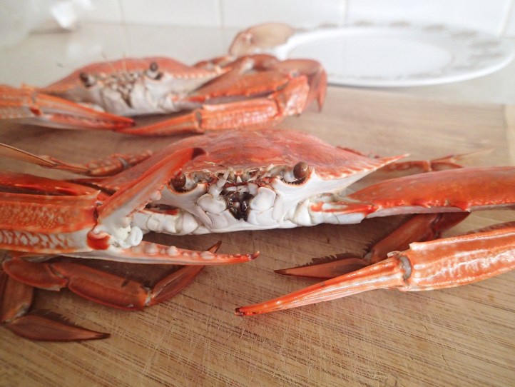 Went to Catalano’s Seafood this morning to buy some seafood for the week. The Blue Swimmer Crabs looked fresh and good so I bought a couple. Also got a bag of mussels. And a whole lot of other stuff too.