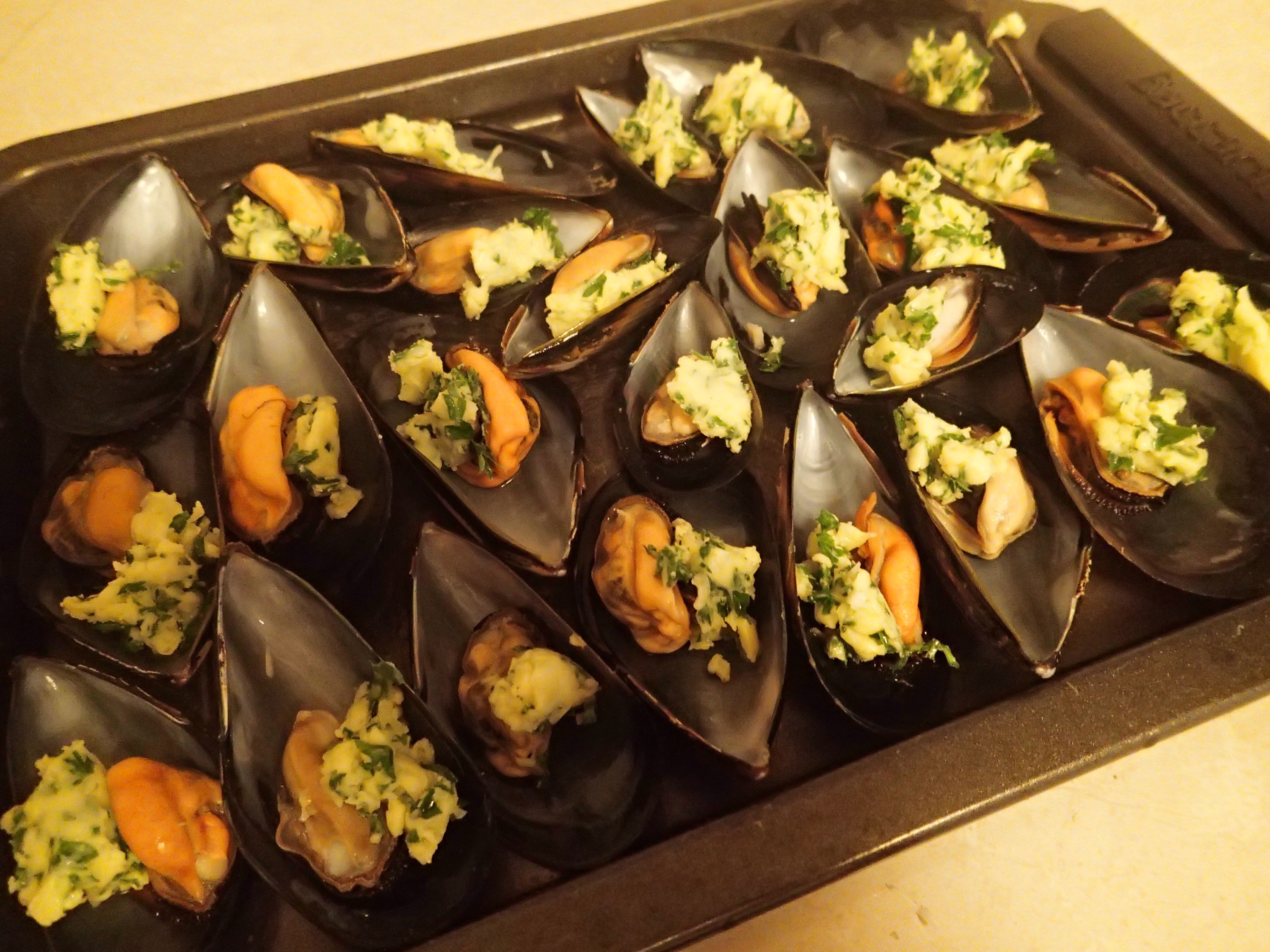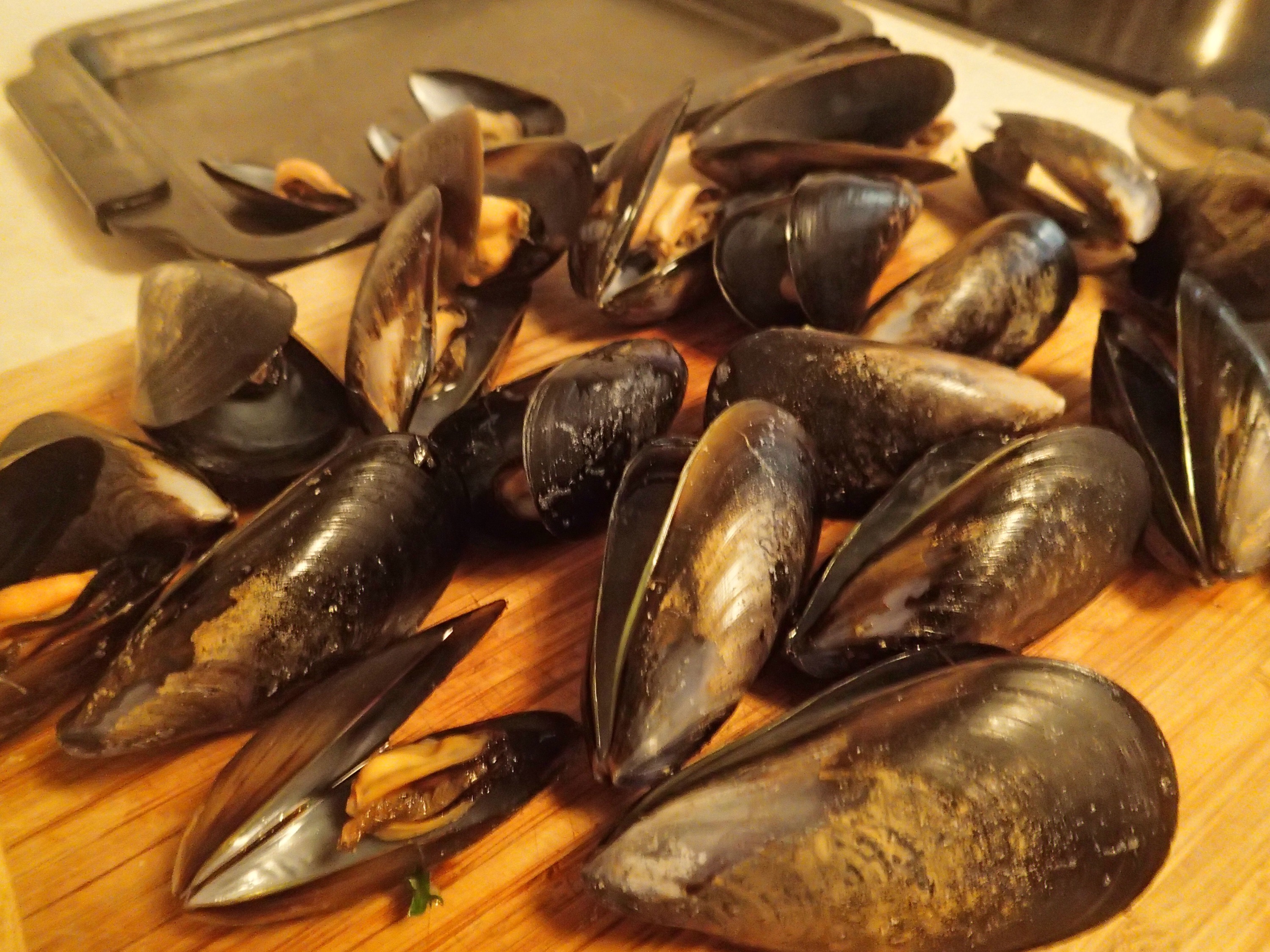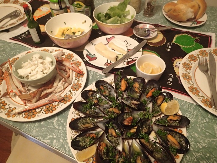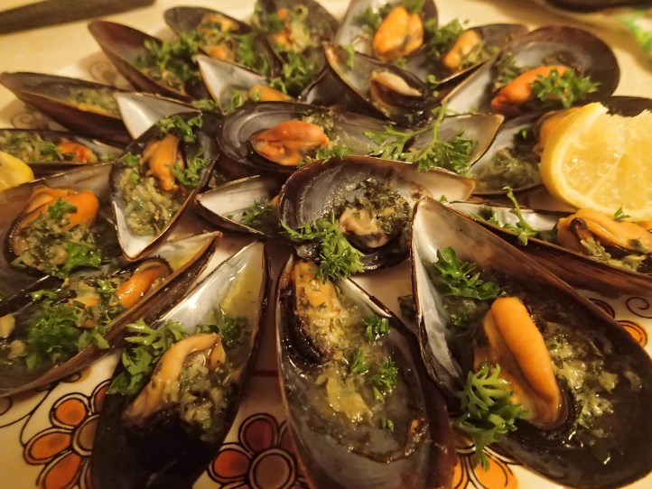 Poor little guys. But, so tasty. I kept the crabs simple. Just cracked them open and got out the meat. For the mussels, I first steamed them to open them up, then took off the top she’ll, topped them with butter, garlic and parsley and briefly cooked them under the grill. Deeeeelicious!
