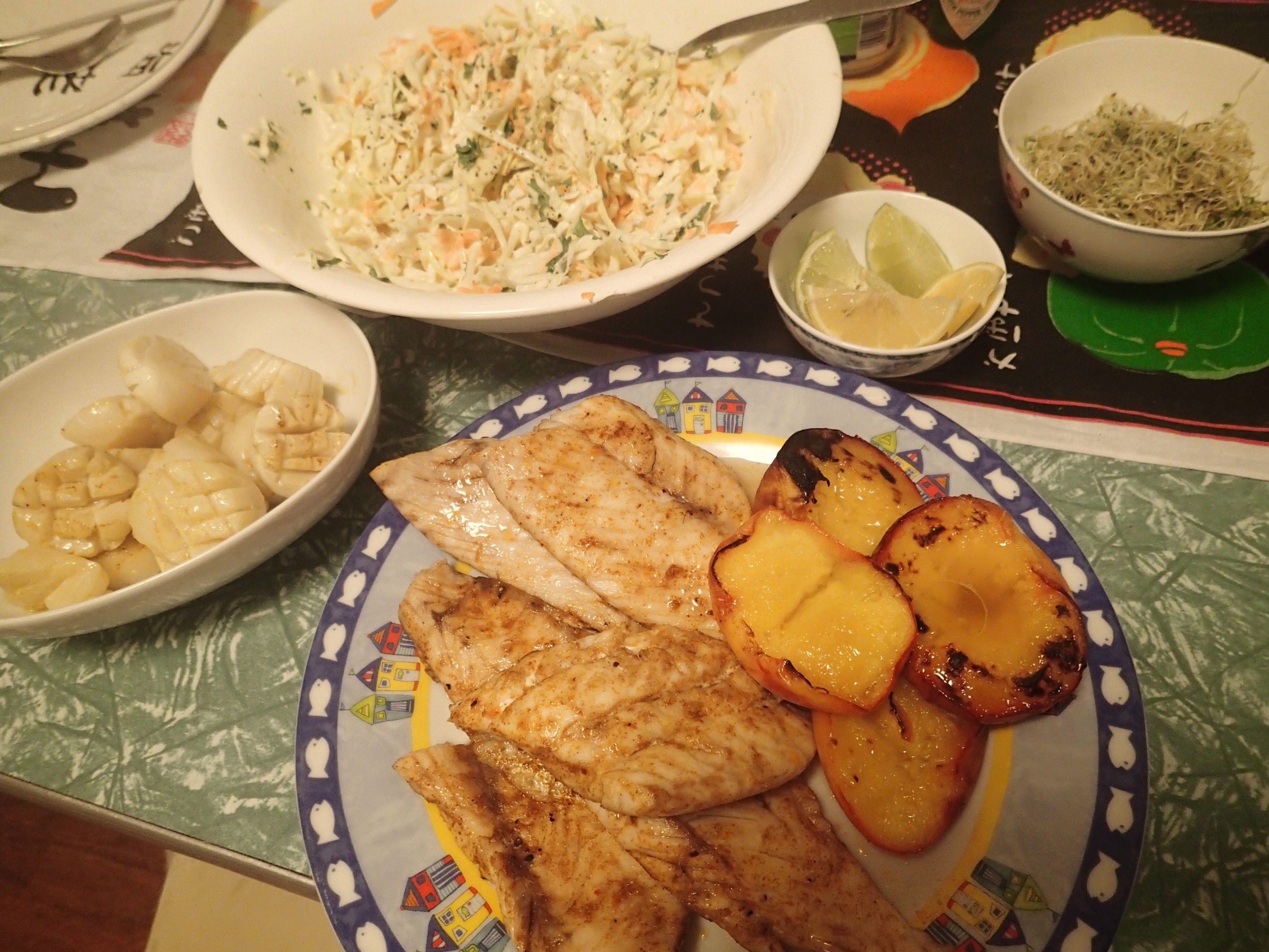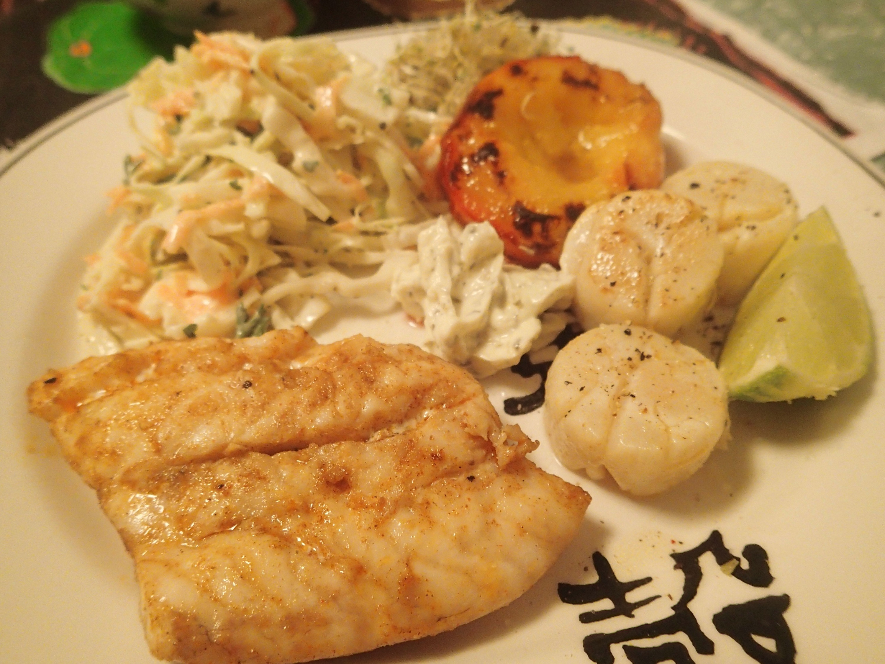 Here we have fish,scallops, grilled peaches and coleslaw.
