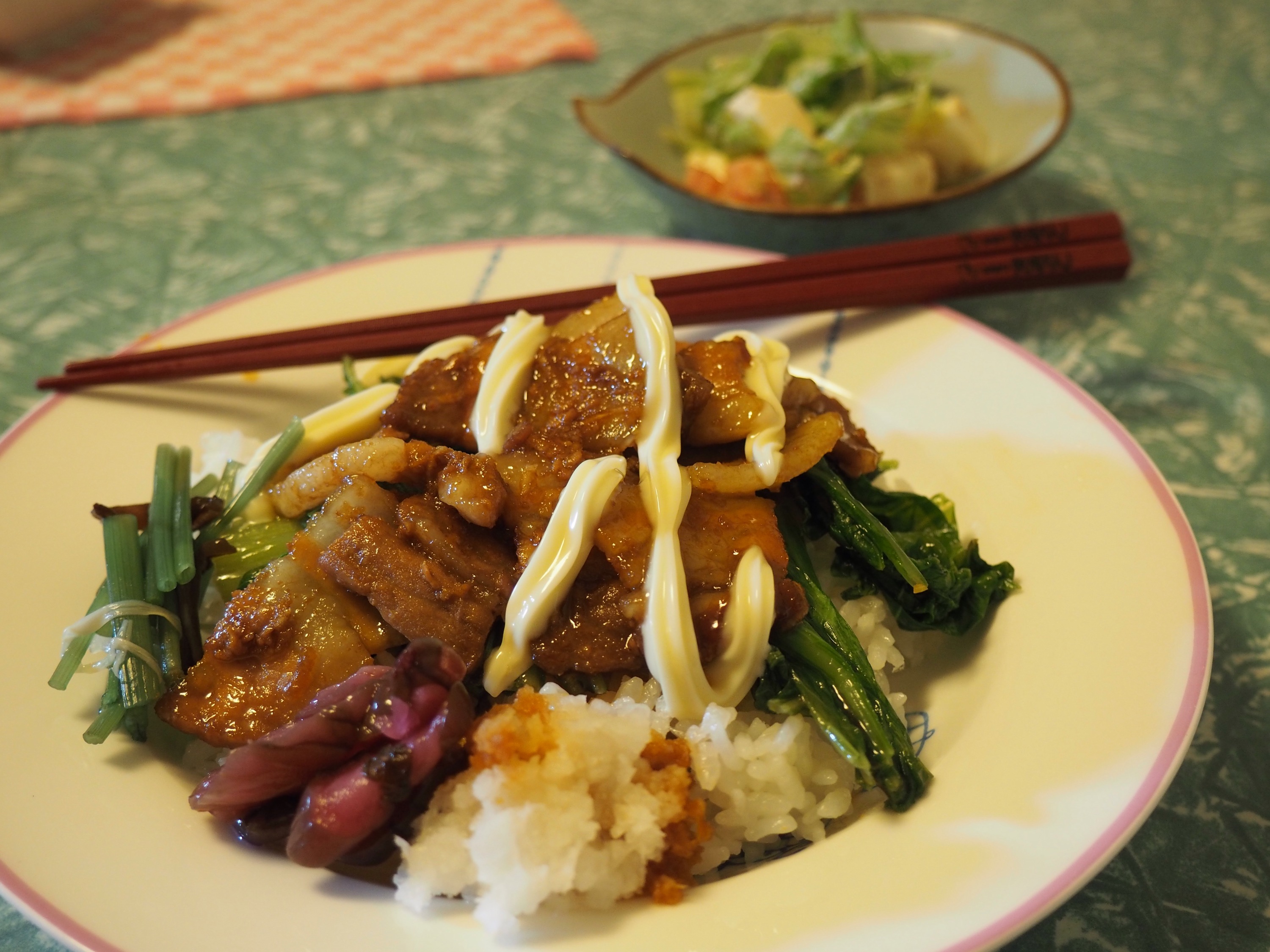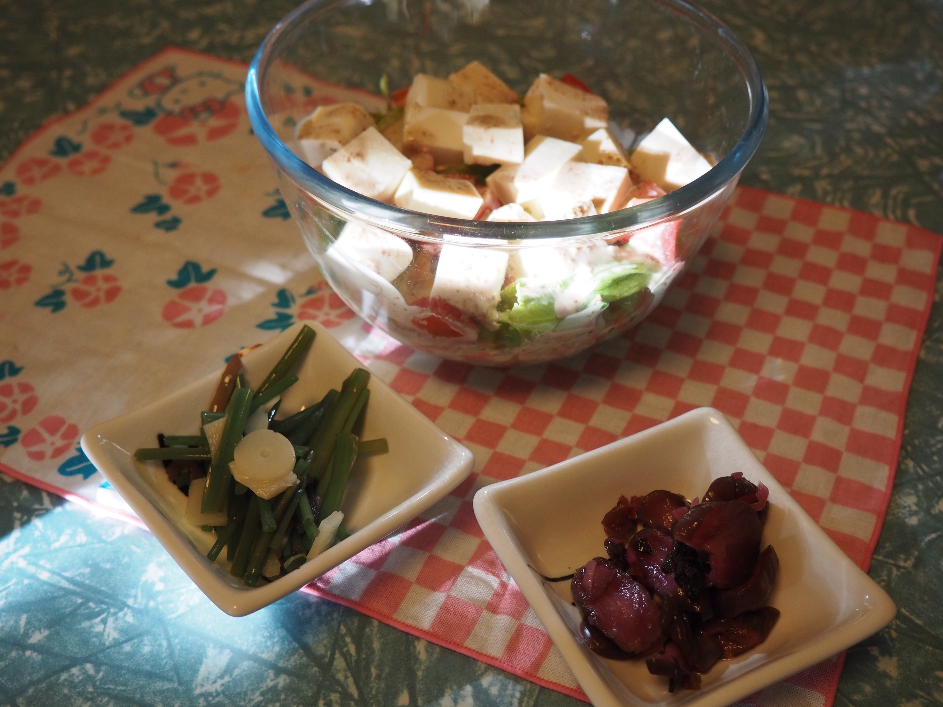 I’ve missed out on a few updates of dinners, but hey, it happens! Here’s dinner from a couple of nights ago – Honey and ginger pork with a tofu salad and pickles.