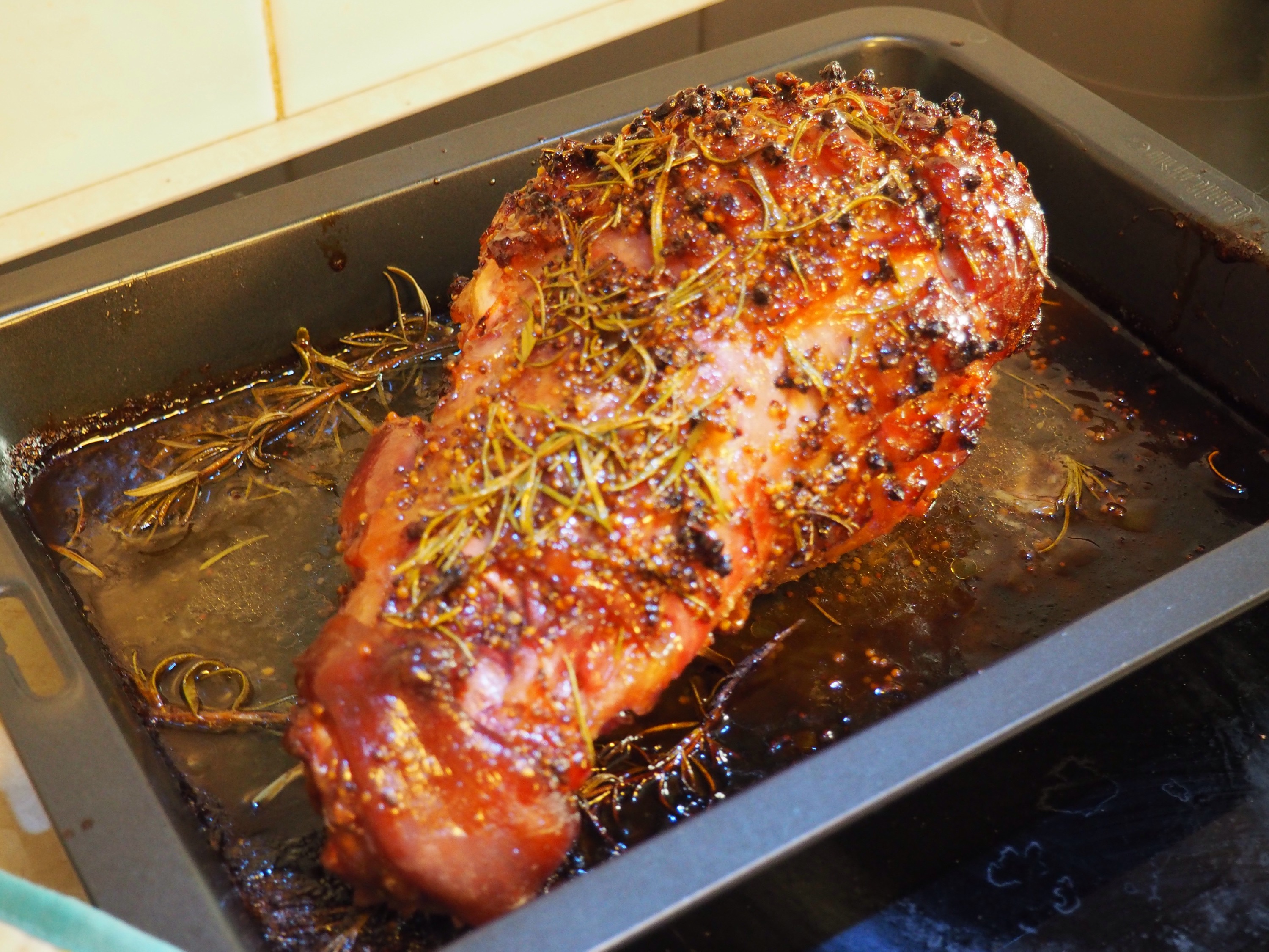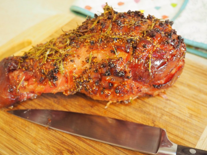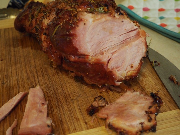 I’ve always seen people bake ham and wondered what that was all about. Isn’t ham already cooked? It’s never been something we ever had growing up. But this year, for whatever reason, I decided that I needed to try it out for myself. My initial plans were foiled however, when I realised how expensive a large leg of ham was. And who can eat that much ham? Determined, I forged on. At the Spudshed one Saturday, I happened across a still decent sized but much smaller ham for a reasonable price and decided that this was the one. I chose to bake this ham today, on Christms Eve Eve Eve, when the temperature was tipped to reach 40 degrees. I poked cloves in it and glazed it with a sauce made from maple syrup, brown sugar and Rosemary. Then I cooked it for a random amount of time (about 2 1/2 hours). It didn’t look as pretty as the ones I see in magazines and TV, but you know what? It tasted delicious! We ate some for lunch while it was warm and fresh out of the oven and it was really bloody tasty! I don’t know why I was so surprised, but I was worried that it would be all dry, but it wasn’t even a little bit dry. The cloves were a bit annoying though, and next time I think I’ll go easier on them. I think I ate about 5 cloves, which isn’t very pleasant at all.