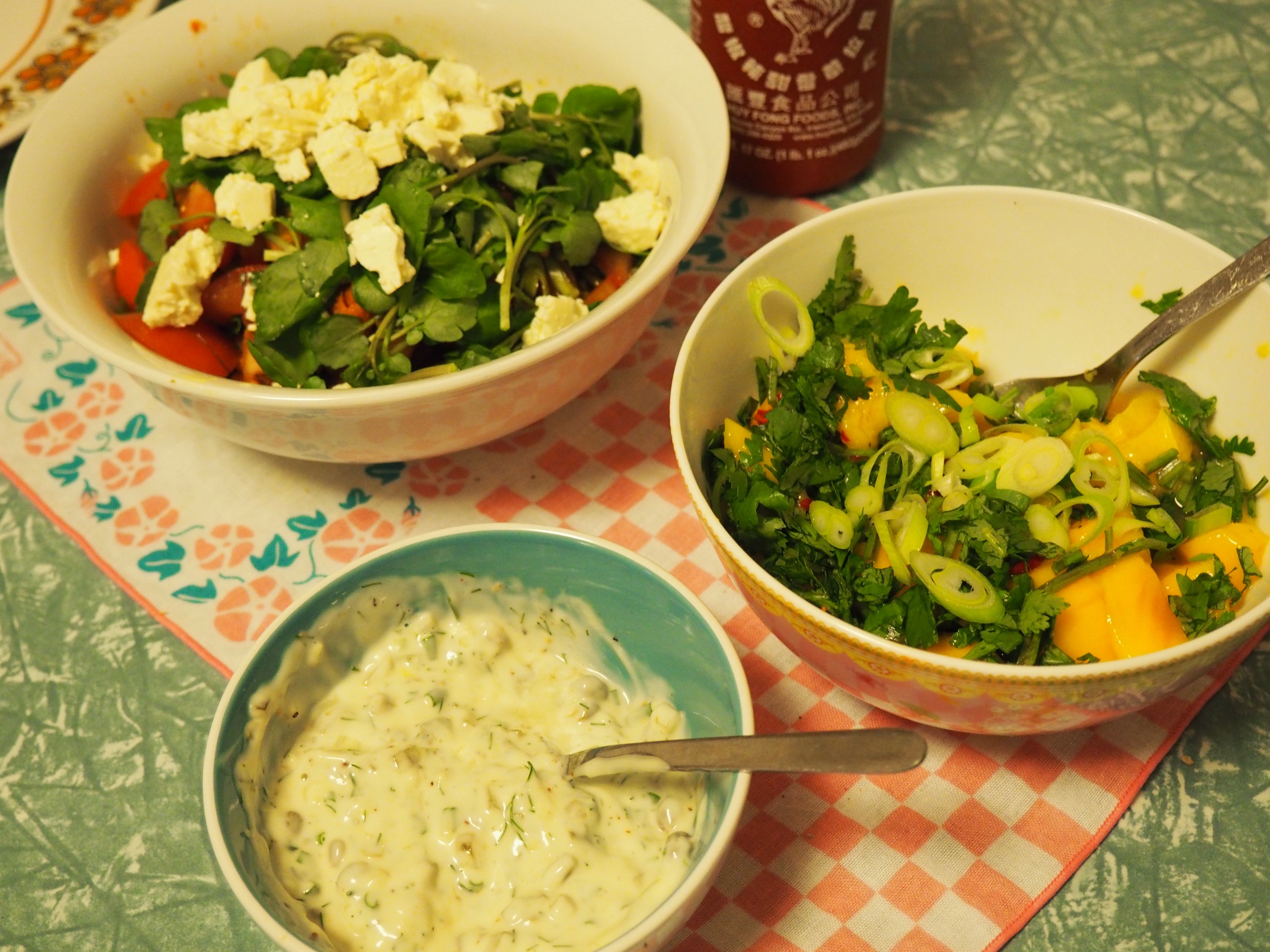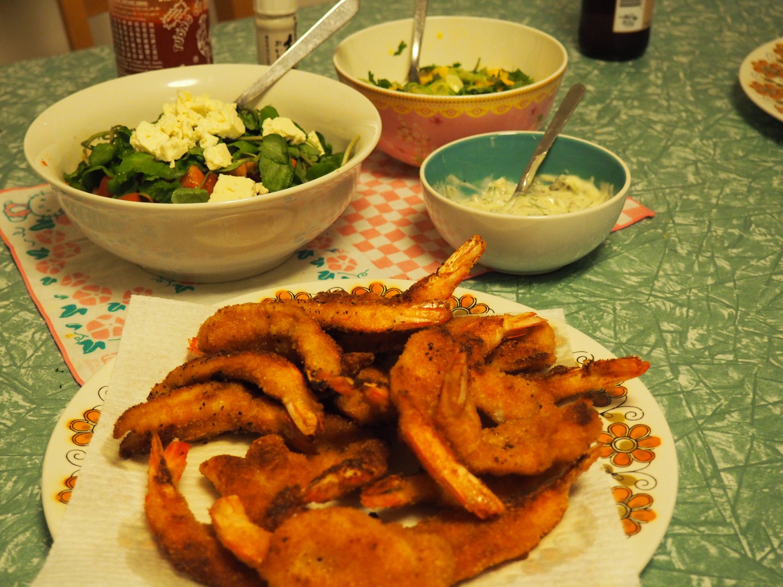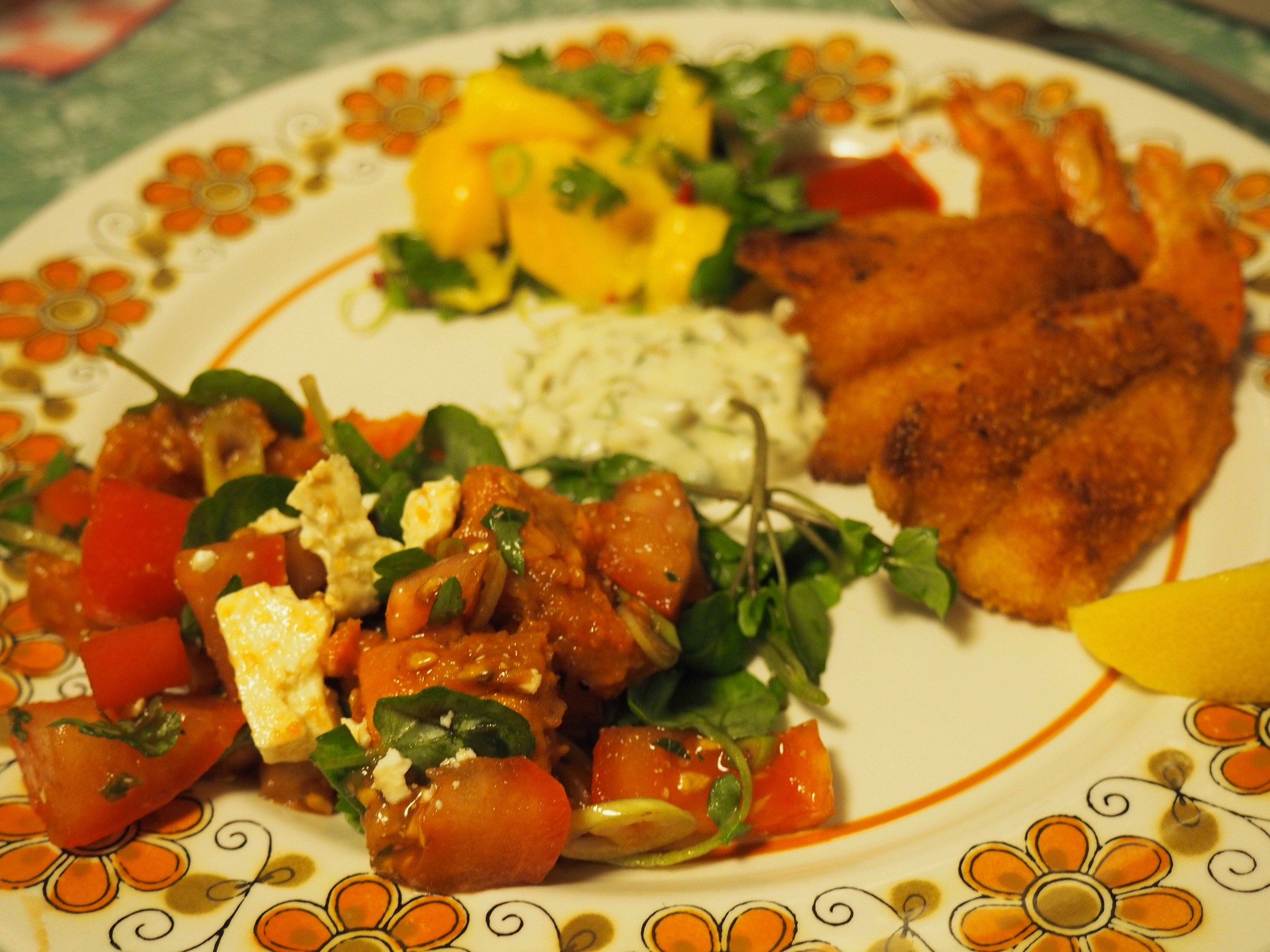 I had some prawns, so I crumbed them and made prawn cutlets. Also made a sweet potato salad and Mango salsa.