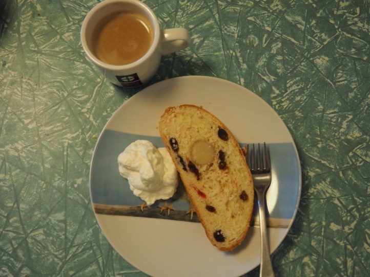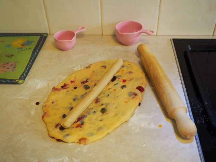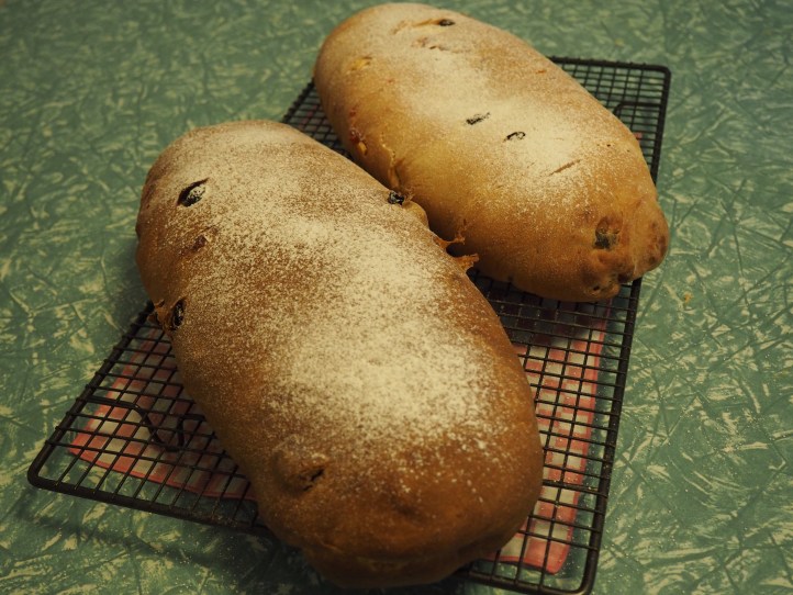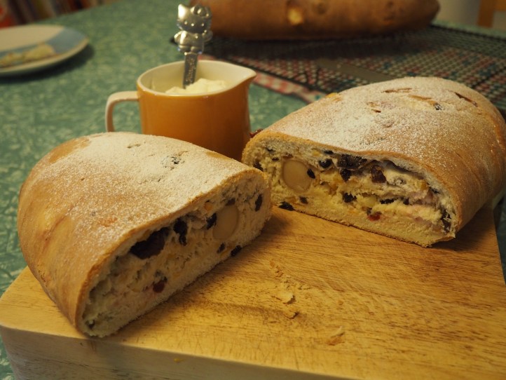 On Christmas Eve I decided it was time to bake. I made two Christmas Stollen (German Christmas fruit cake for those wondering). They take quite a while to make, lots of waiting around for the yeast to rise or whatever. It was the first time making stollen in our oven, so I was a bit concerned how they would turn out. I think I undercooked the first one a little as when I cut in to it, it was still a little doughy on the inside. But the second one was perfect thankfully.