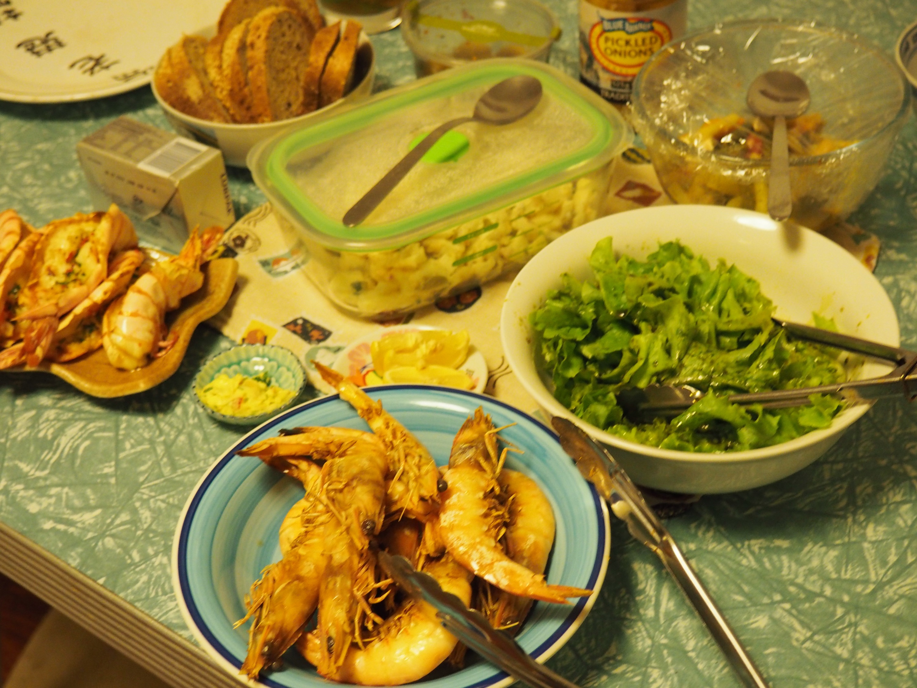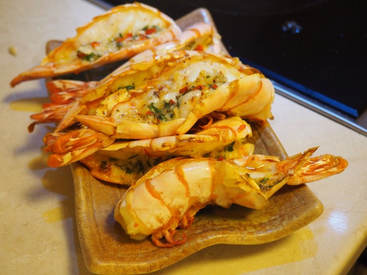 We decided to try our luck and put some prawns on anyway, but after about 15 minutes and them only just starting to cook, I ended up cooking them (and the other prawns i had) under the grill. We ended up having dinner around 10pm, which made it easy at least for us to stay up until midnight. Next time : start up the BBQ much, much earlier.