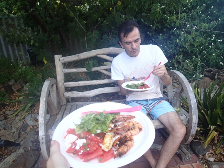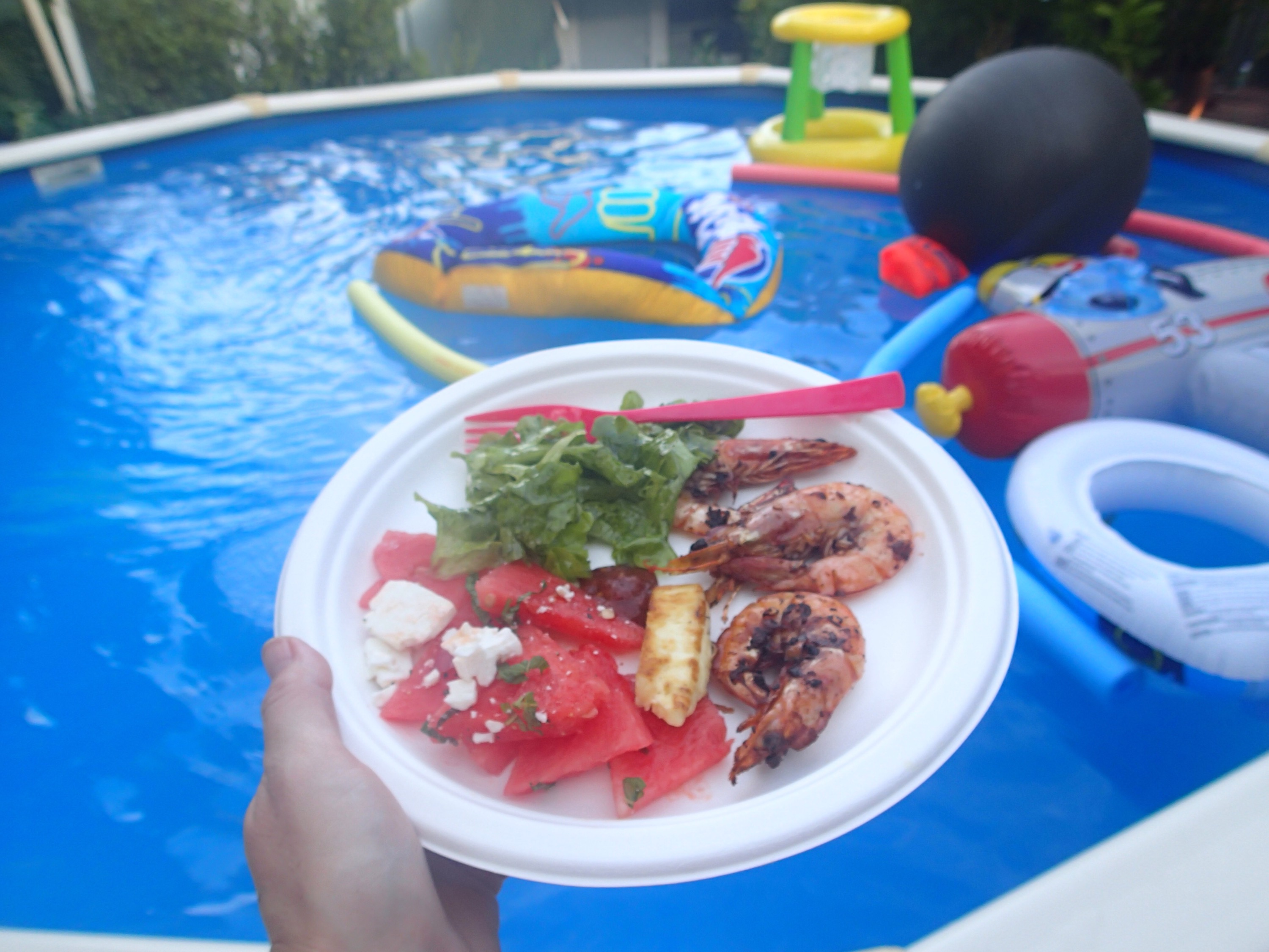 On New Years Day we normally go and chill in a park somewhere and have a picnic. This year, we decided not to do that due to various factors. Luckily, our friends Chad and Ren invited us all around for a BBQ and Pool Party, although I didn’t actually go for a swim, but I did put my legs in the pool. We packed some drinks and I made up a couple of quick salads and brought some prawns for the BBQ.