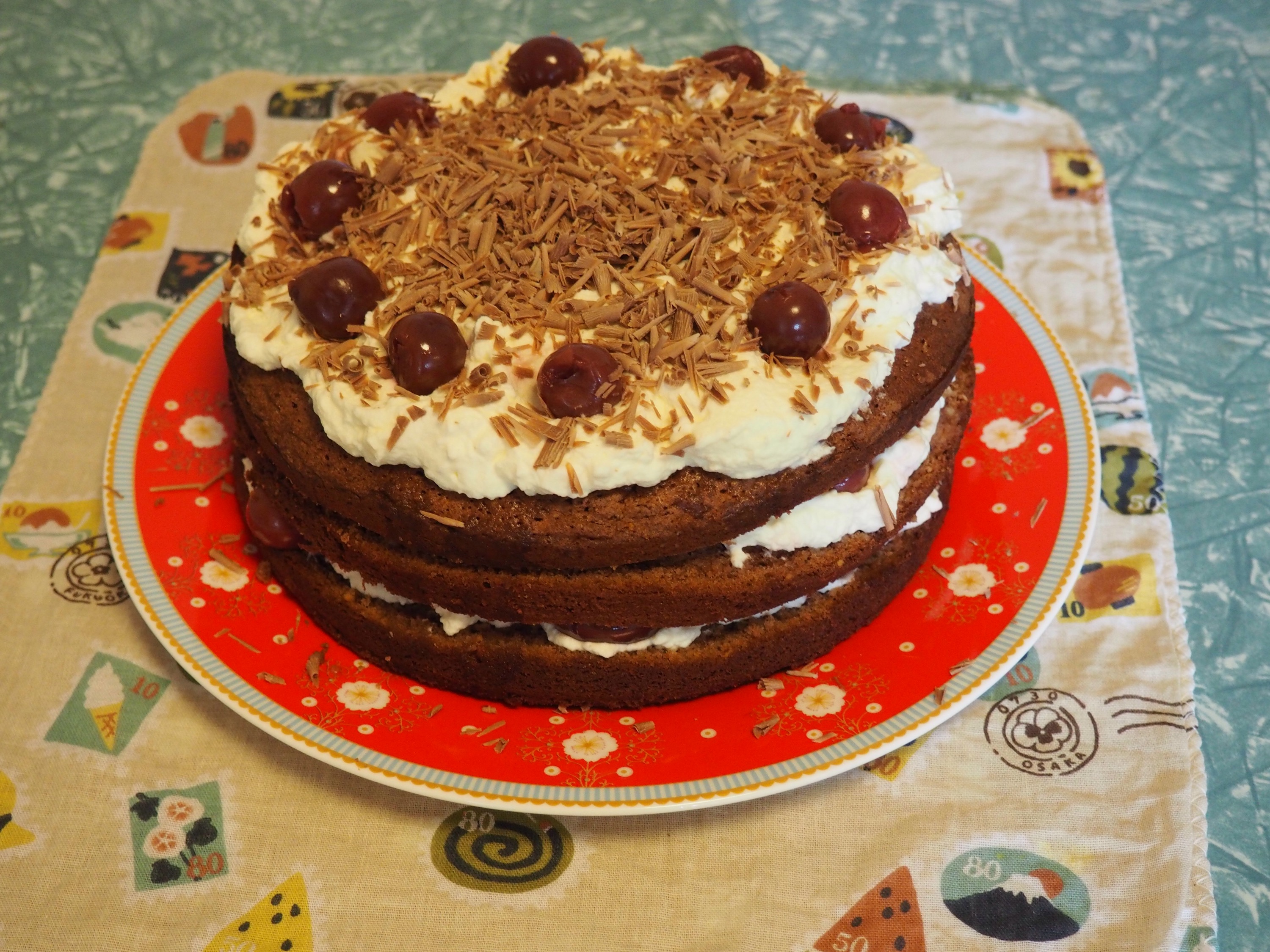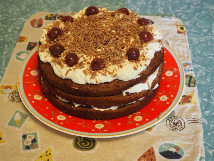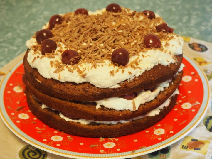 Once the cake cooled, all that was needed was to assemble it. Layers of cream, cherries and Kirsch, and topped off with grated chocolate. In the end, it actually was but that hard to make. And it was delicious. Would make again.