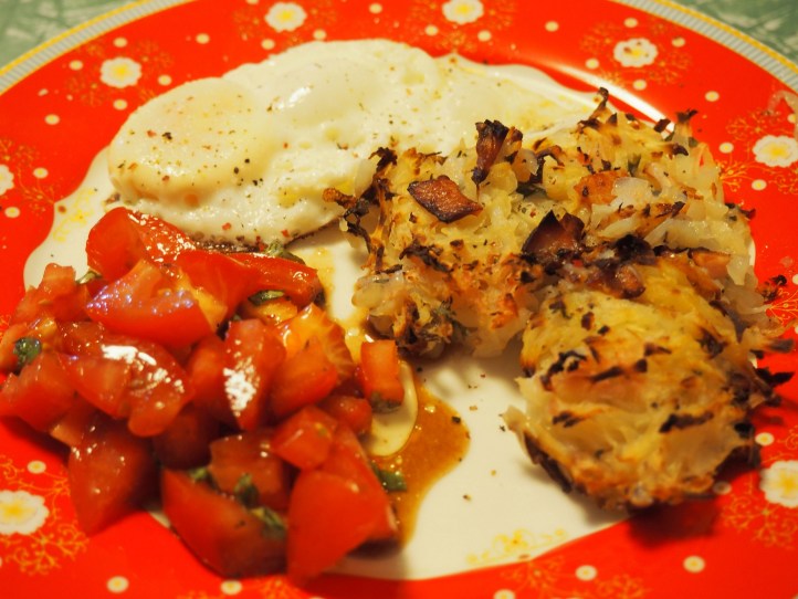 Firstly, mini potato rosti’s with egg and tomato salad