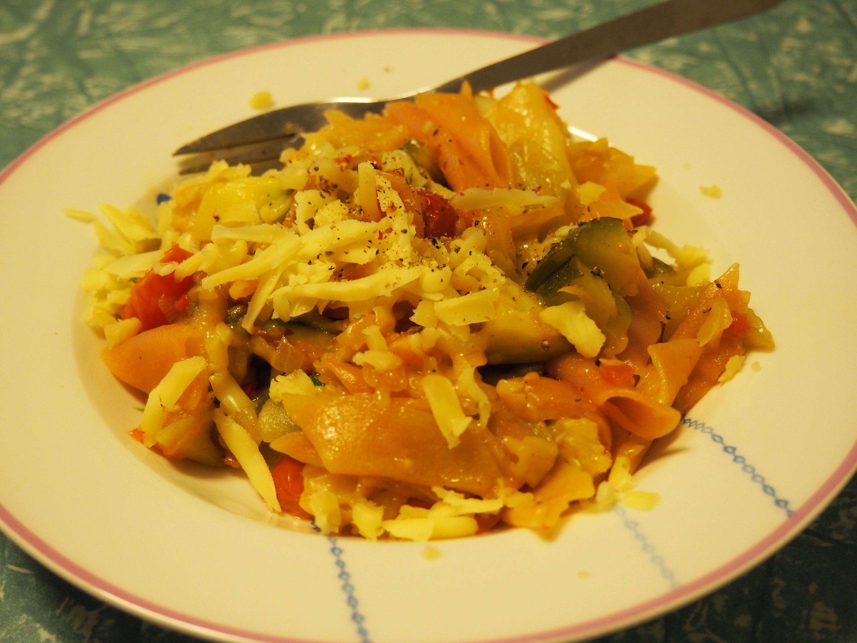 Then, pasta with tomatoes, zucchini, shallots, basil, anchovies, olives and capers. It was actually really nice.