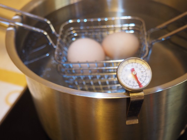 I had another go at making “Onsen eggs” on Friday. In other words, slow poached eggs in their shells. It took about 40 minutes with the eggs in water kept at around 140 degrees Celsius.