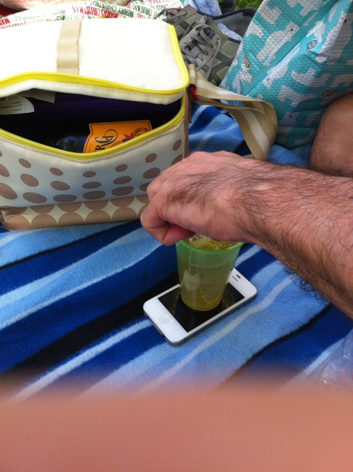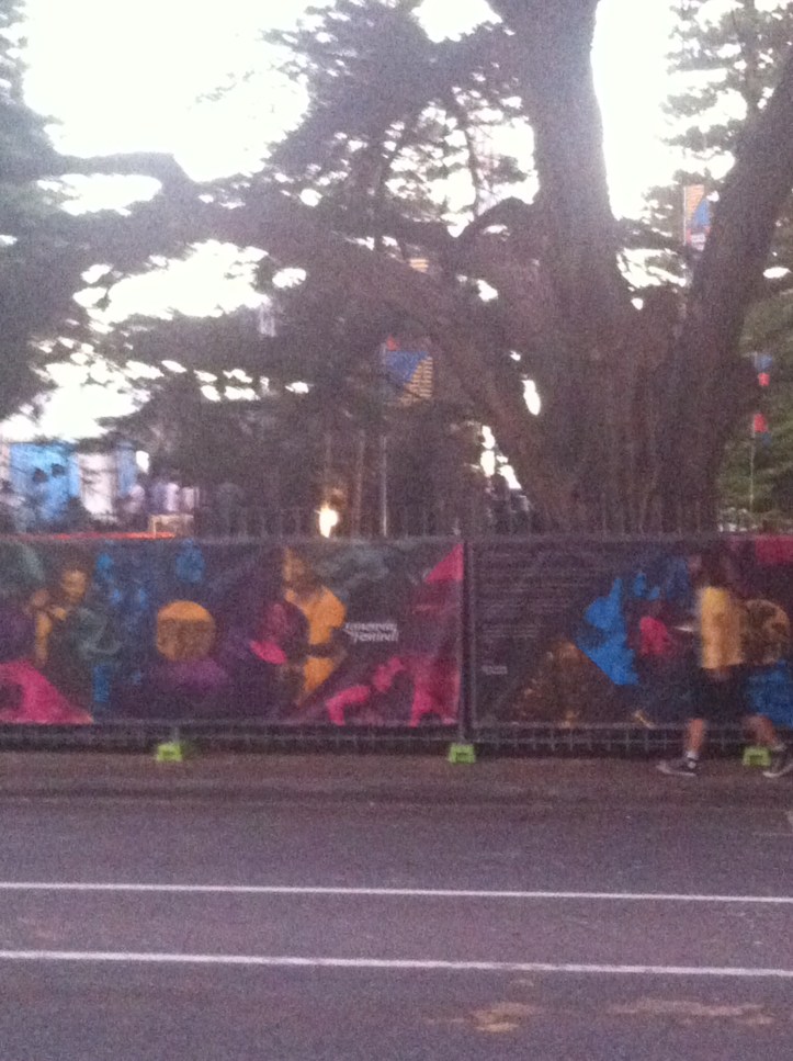 Laneway Festival was on at the Esplanade park across the road. We had ummed and ahhed about going for months. But we eventually decided we couldn’t really afford it, and there wasn’t anyone we really HAD to see. One of the bands we were interested in seeing was Battles, and just as we were leaving LC, they were starting their set. We decided to see if we could watch them from behind the fence. We walked around a bit, but then discovered a bar next to the Esplanade Hotel where we could not only hear the band perfectly well, but could see alright too. So we settled in with a drink, I stole some guys seat (by accident) and enjoyed Battles. I tried to take a photo, but you can really only see fence and cars in the photo. In reality I could actually see quite well. Plus, it was entertaining seeing all the foolish people trying to jump the fence in to the festival.