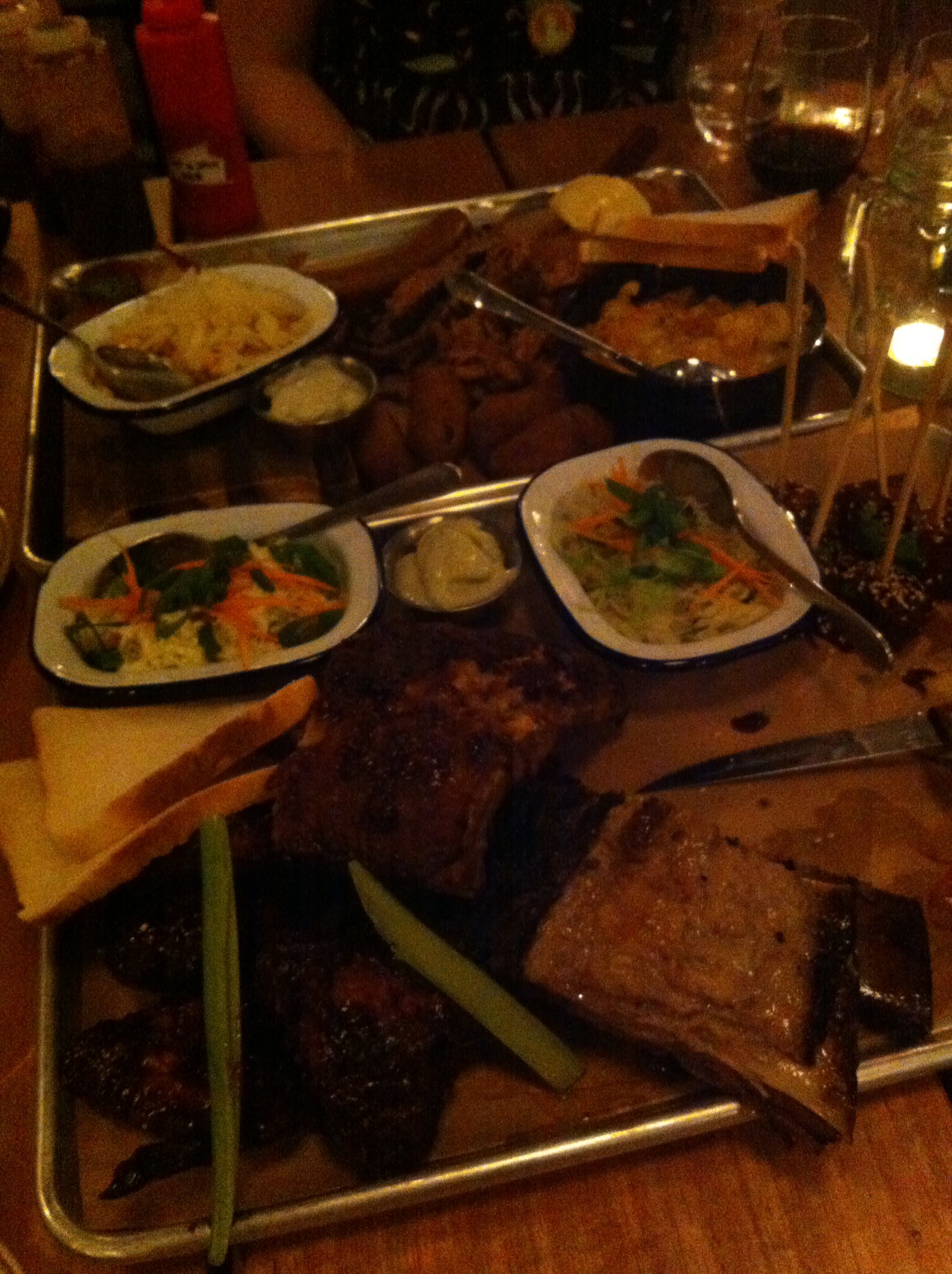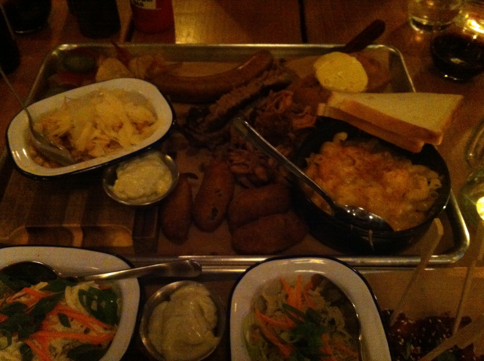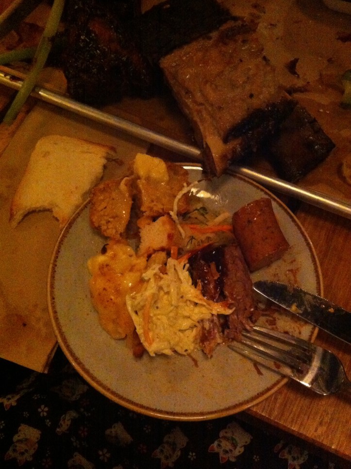 At 7pm we headed over to Side Door Bbq. We ordered some drinks and a huge platter of meat. Brisket, pulled pork, ribs, etc etc the platter also came with coleslaw, cornbread, white bread,corn and jalapeño poppers.