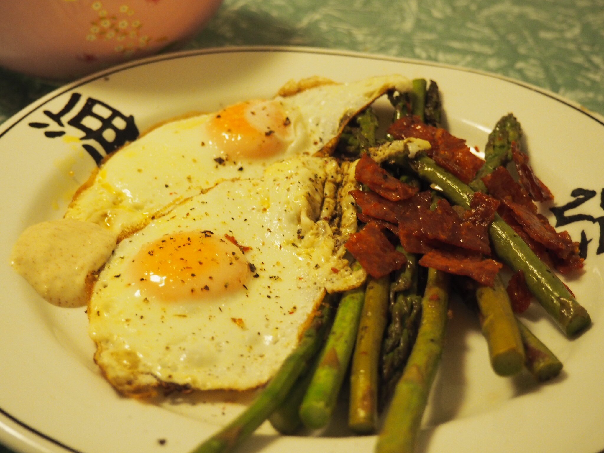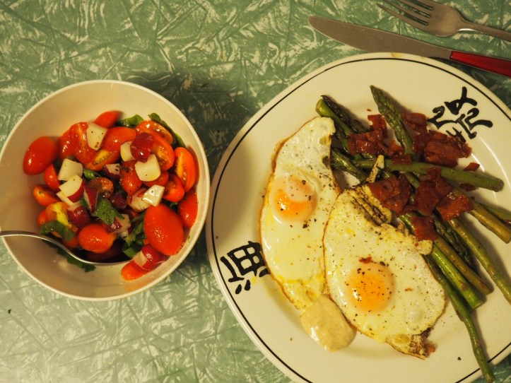 After last night’s BBQ meat fest, we are both still a little full today. I cooked up some asparagus with eggs and crispy salami (it was meant to be chorizo but I didn’t have any)