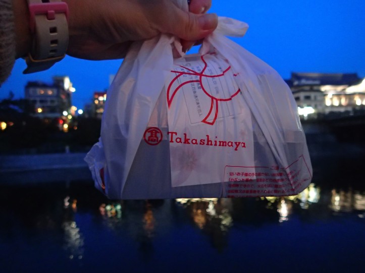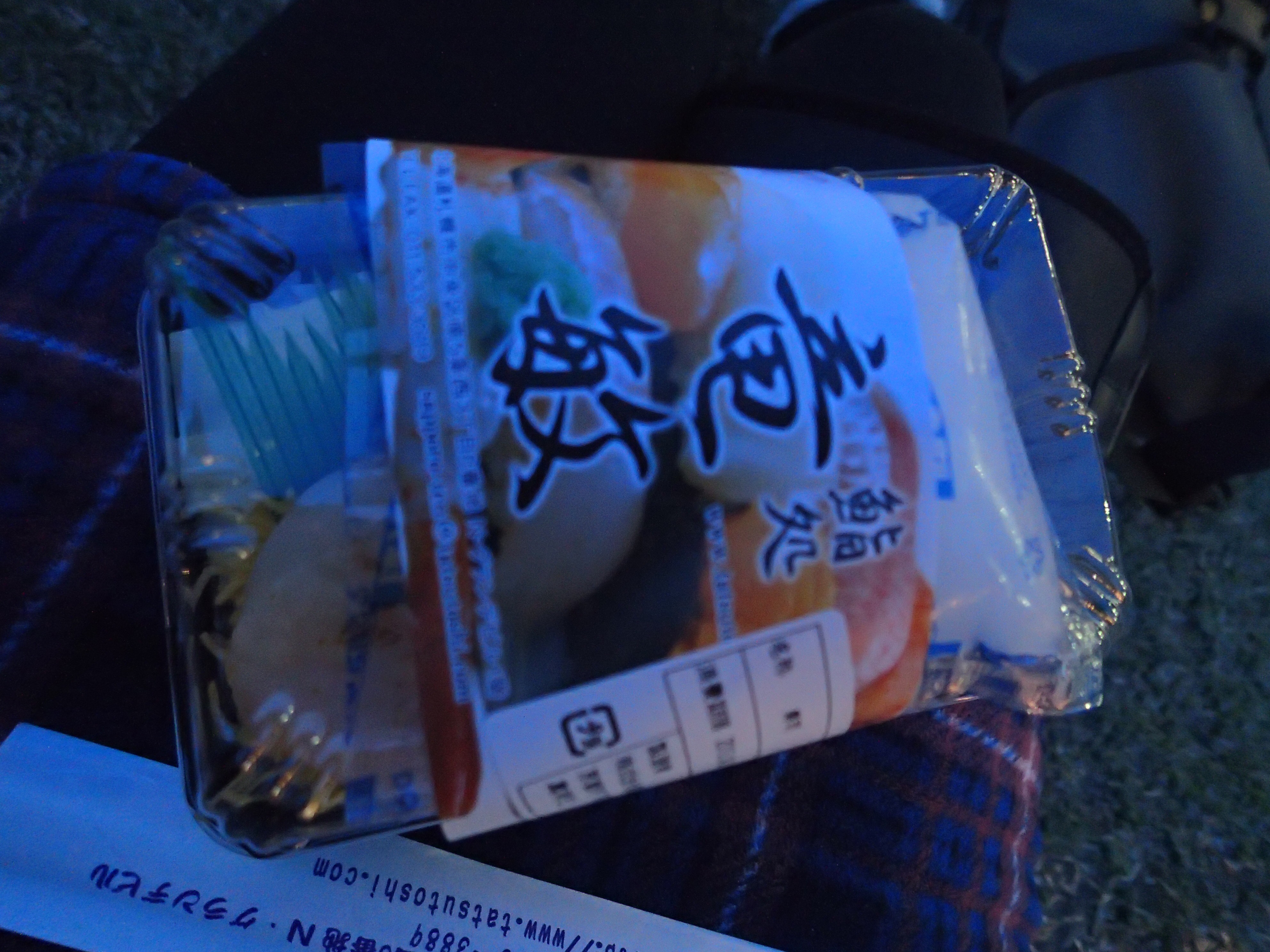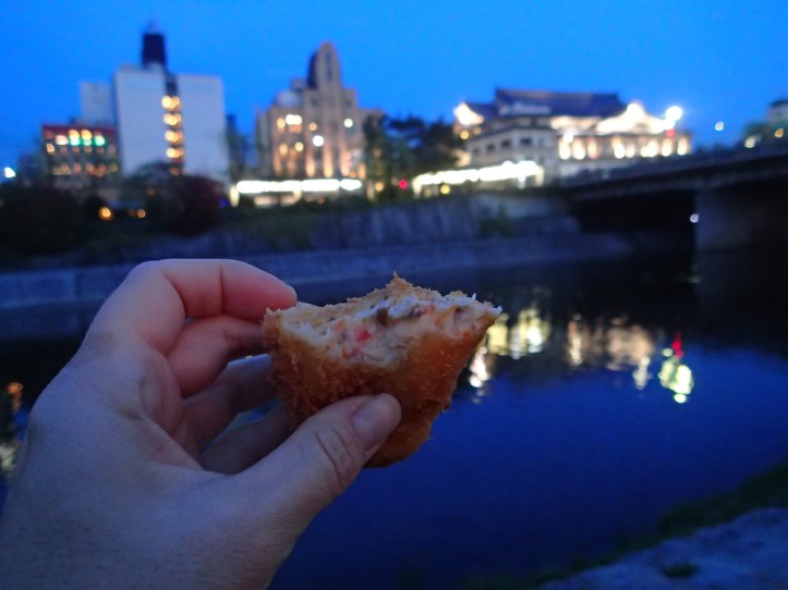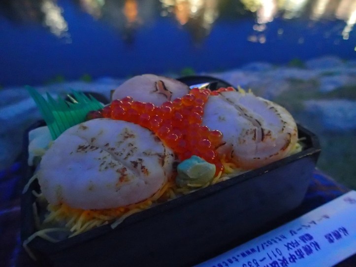 Dinner was in bento form also. When we saw these in Takashimaya at special Hokkaido promotion event, we could not resist those scallops. We also got some crab croquettes. We ate them by the river.